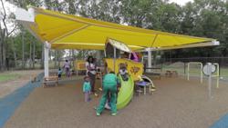 [video: fade in to a yellow SkyWays Cantilever playground shade cover a Smart Play Motion playground. A man wearing medical scrubs assists a young girl down the Motion playground slide. Children play all around the fenced in play area.]
