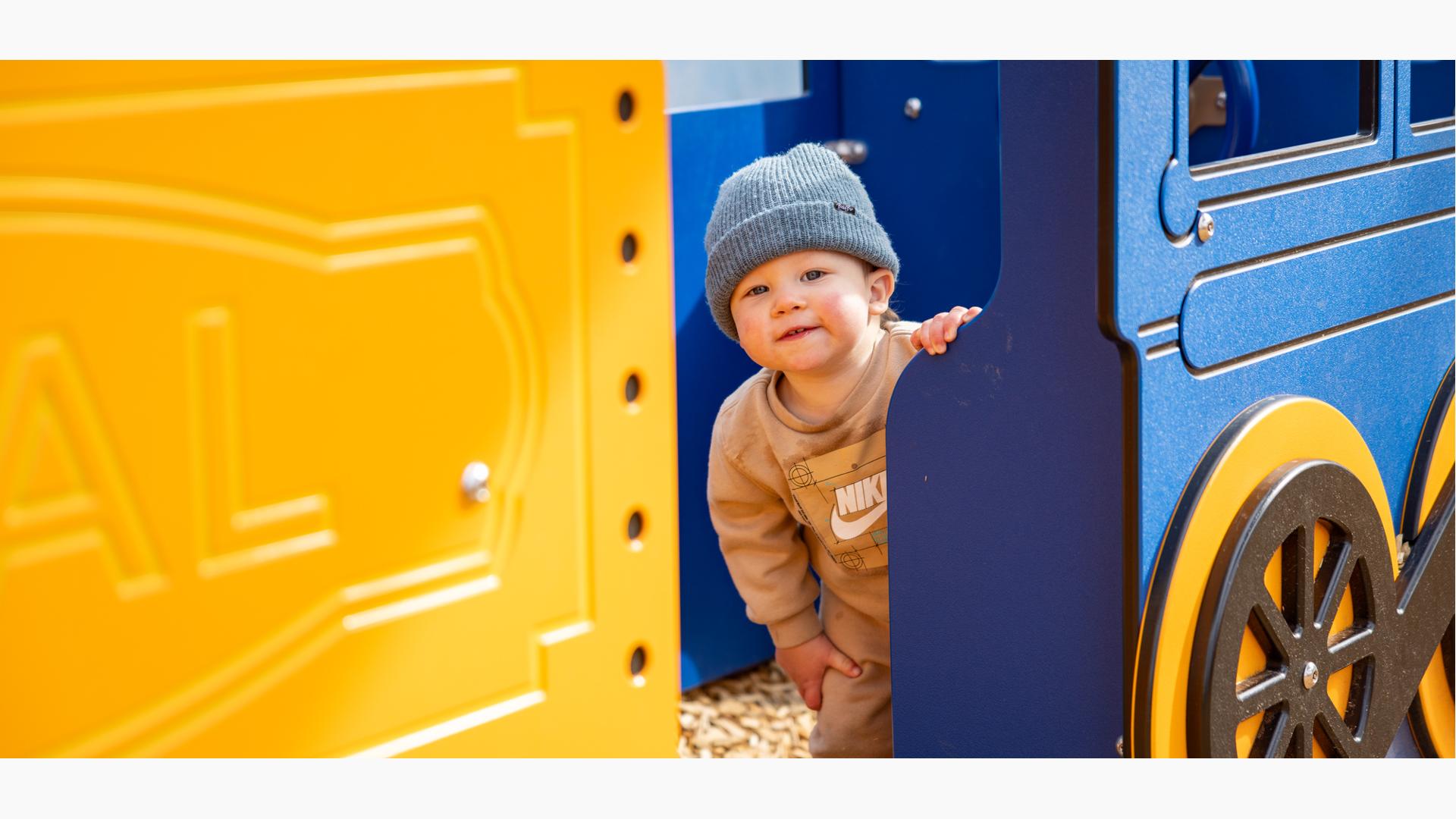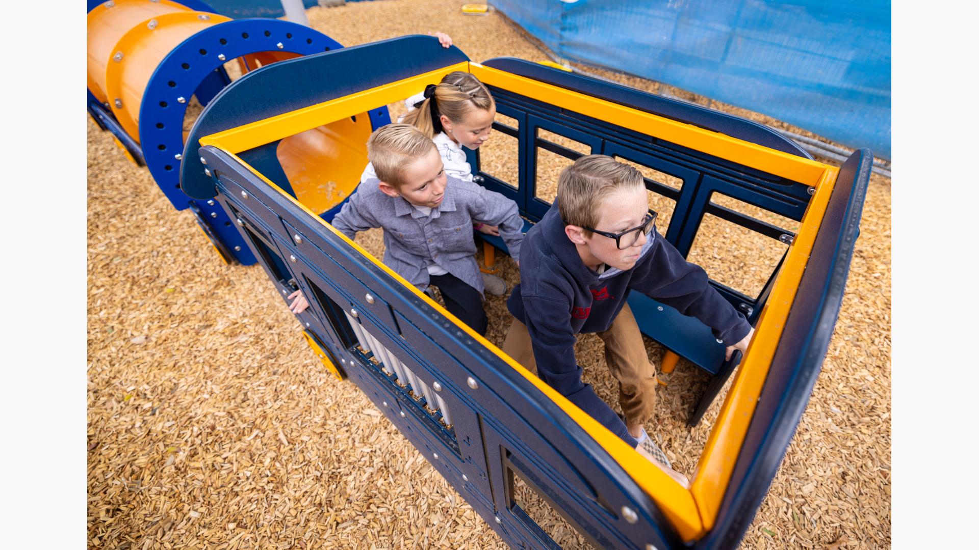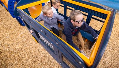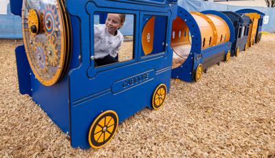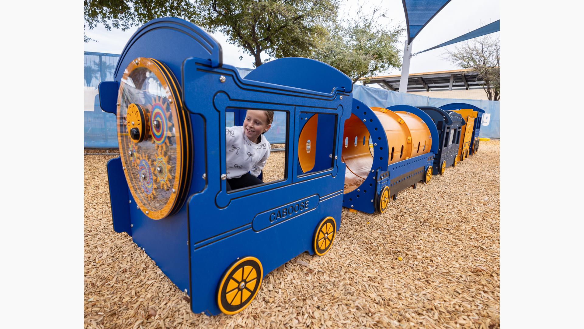 Playing off the railway theme, there's a custom train play structure for 2- to 5-year-olds made up of an engine, three cars and a caboose—all with their own imagination-boosting interactive play elements. Also in the preschool section, there's a Smart Play® Motion playstructure and a PlayShaper® playstructure offering endless possibilities for climbing, sliding and exploring.