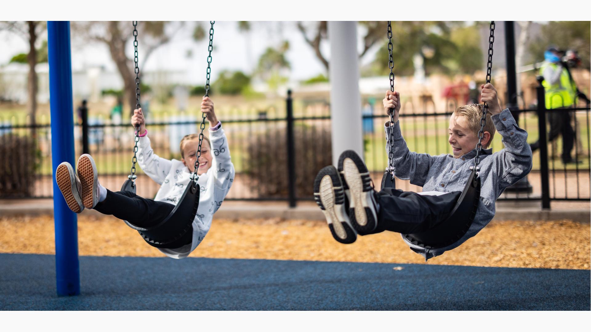 Close by, five different spinners—a Global Motion®, two Curva® Spinners, a ReviWheel® and an OmniSpin®—and a four-bay Arch Swing set provide the motion play kids adore.
