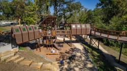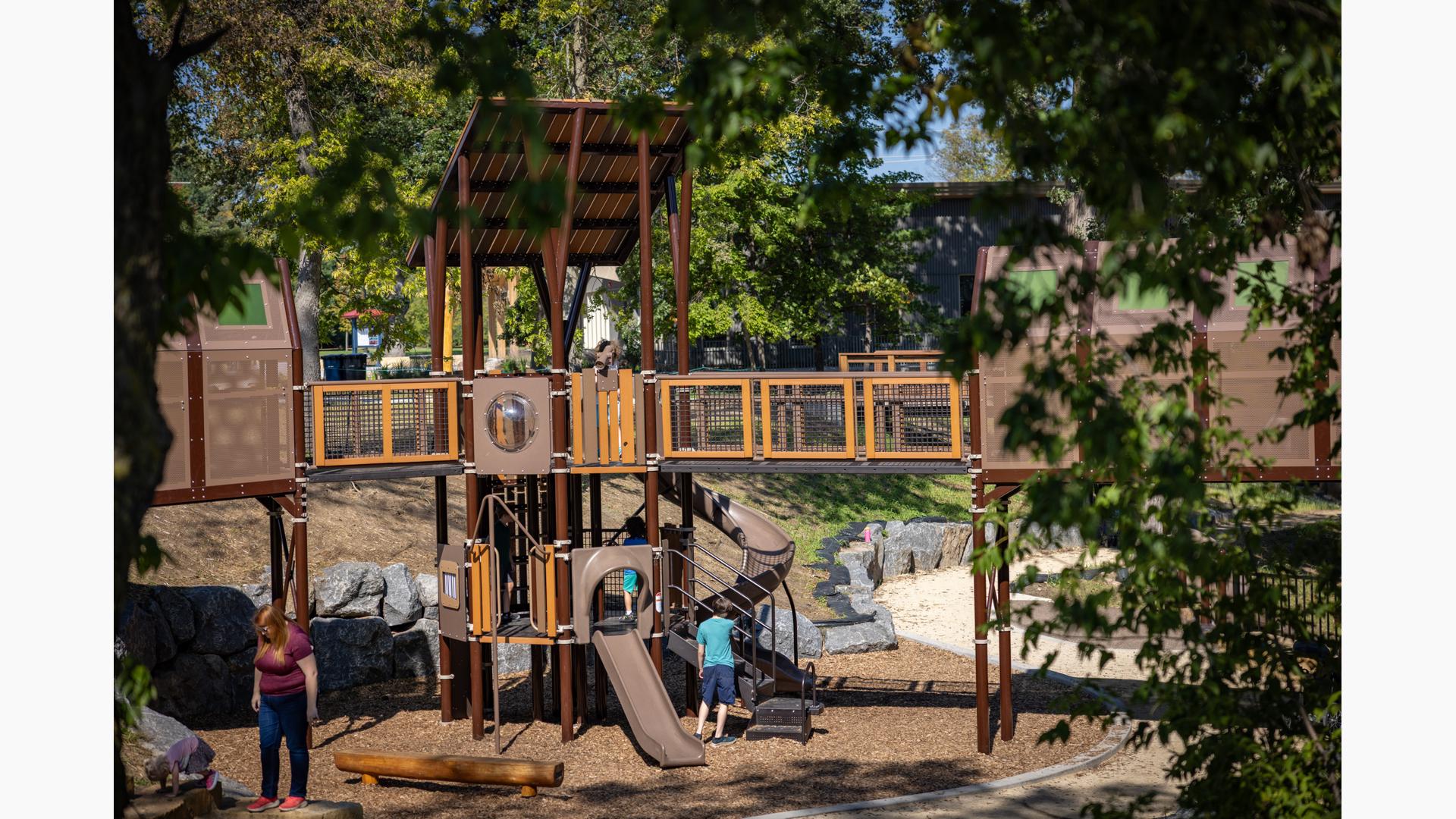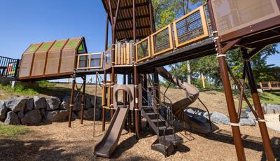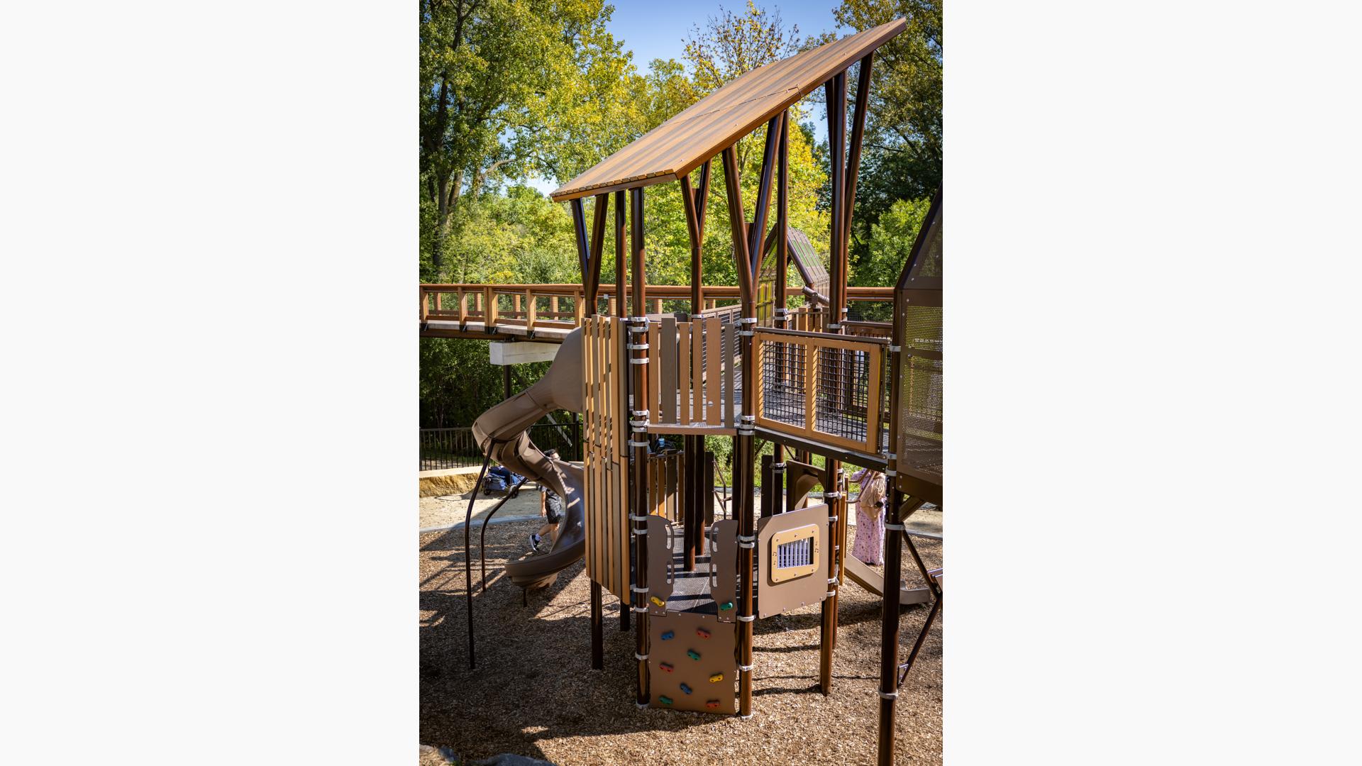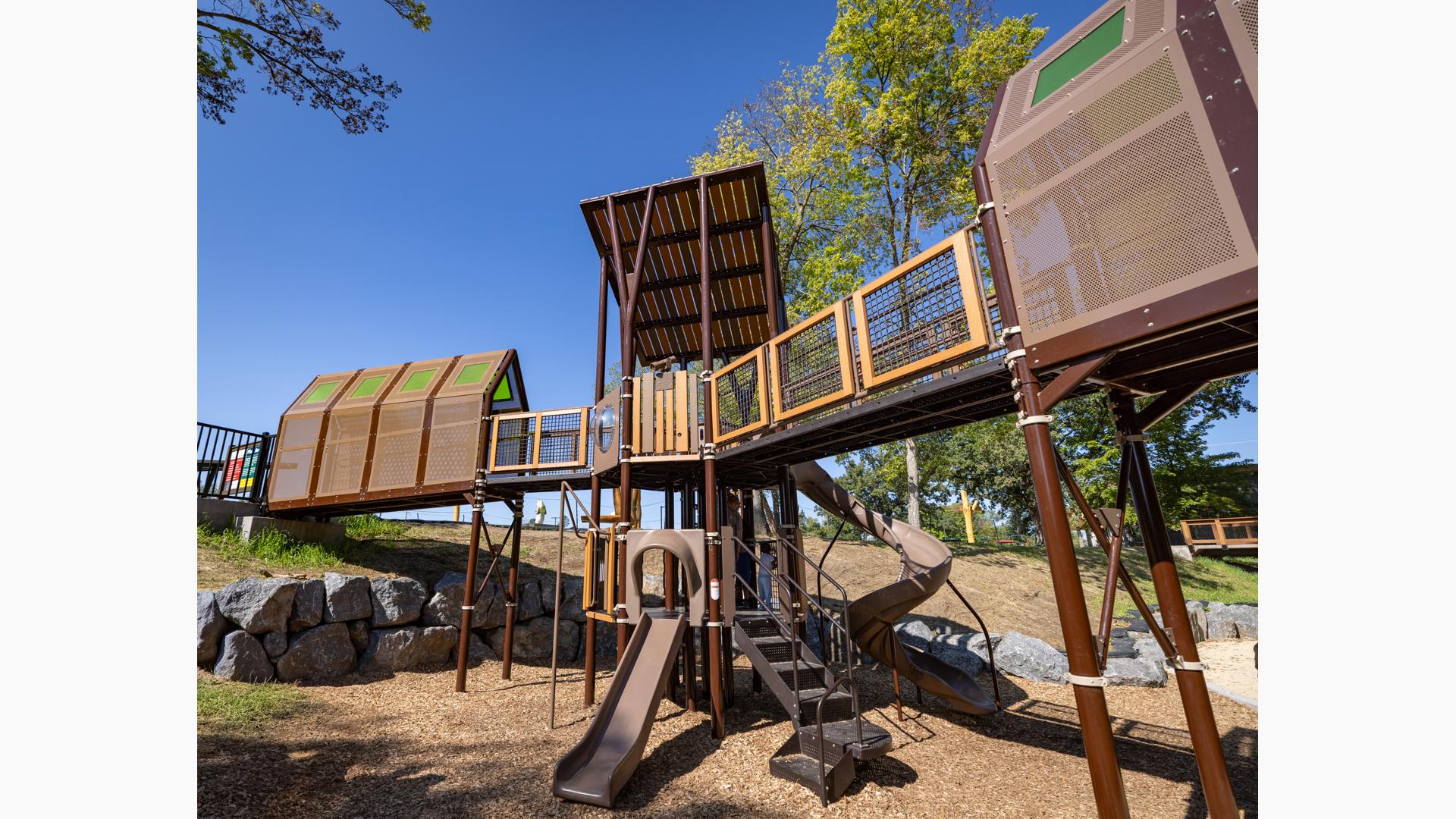 Designed to work with the features of the land and topography, the play experience unfolds along the natural slope at the trail's edge. Custom bridges with acrylic "window" panels span the gaps between the PlayBooster® tower and call to mind historic railroad tunnels from the industrial era. Several slides follow the terrain's downward slope from an upper to a lower trail section, while Log Steppers® lead the way back up the bank, encouraging movement that feels intuitive and adventurous. The multifaceted PlayBooster tower anchors the space with climbing routes, interactive play panels, and a choice of slides.