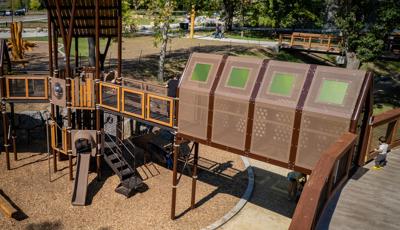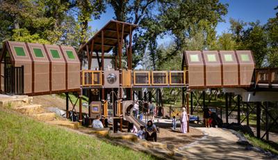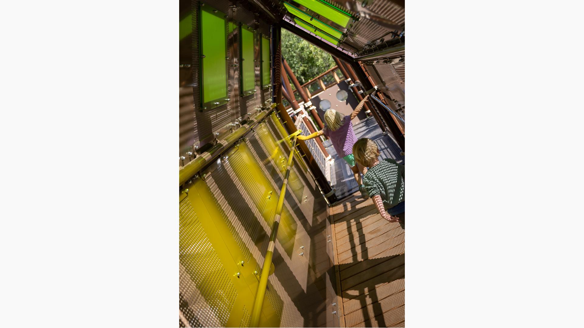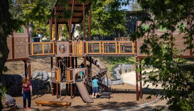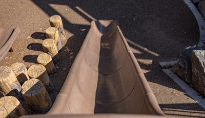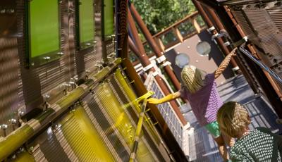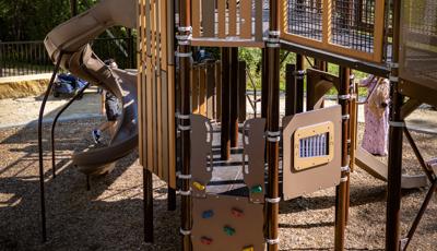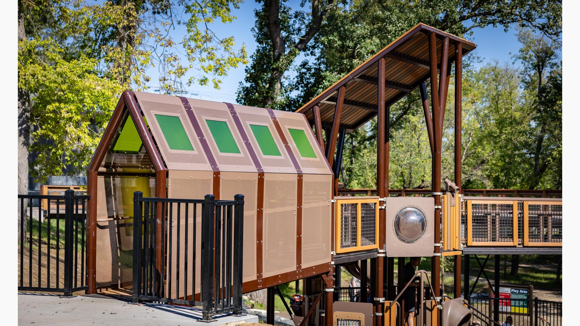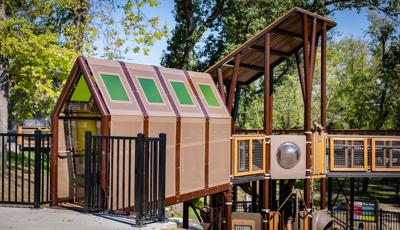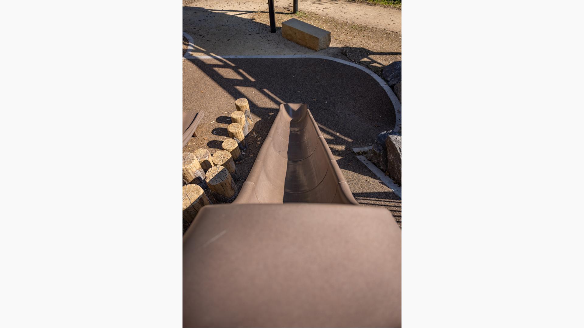 Designed to work with the features of the land and topography, the play experience unfolds along the natural slope at the trail's edge. Custom bridges with acrylic "window" panels span the gaps between the PlayBooster® tower and call to mind historic railroad tunnels from the industrial era. Several slides follow the terrain's downward slope from an upper to a lower trail section, while Log Steppers® lead the way back up the bank, encouraging movement that feels intuitive and adventurous. The multifaceted PlayBooster tower anchors the space with climbing routes, interactive play panels, and a choice of slides.
