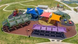 Contact Your ConsultantSkyWays® shade structures create color-coded play zones at this vast, inclusive playground in Rogers, Arkansas. Different colored areas feature fun little imaginative ecosystems separating the various play experiences. The blue area is a fully ramp-accessible interconnected PlayBooster® structure for 5-to-12-year-olds featuring a futuristic star-studded sensory experience tunnel, multiple slides, GeoPlex® Climbers and numerous interactive learning panels. Under the orange and red shade await the inclusive We-Go-Round® and OmniSpin® Spinner, while an oblong purple zone features a 5-bay swing set for children of all ages and abilities. 2-to-5-year-olds are the masters of the green universe, where more fully ramped PlayBooster® equipment features slides, climbers and learning panels just right for kiddos their size. Nearby, a Netplex® cable net tower with springy rubberized belting invites older kids to climb, and then descend the super tall twisty slide. A four-bay inclusive ZipKrooz® ensures that the motion fun never stops. For the hottest days, there’s an Aquatix® splash pad just next to the playground, so kids can cool off and then come back for more color-inspired play.