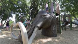 Riki Frea voiceover: created a great opportunity to build a very unique park. [video: camera switch to wooly mammoth shaped climbing structure.]