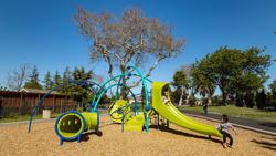 The playground at Old Alvarado Park features modern, arched Evos® and Weevos® play structures, which are attractive to kids due to their multiple entry points and unique look. Kids ages 5 to 12 will love the novel options available to them, like the LolliLadder™ – a fresh take on monkey bars that builds upper-body strength, and a Swiggle Stix Bridge®, which emphasizes balance and coordination. Netplay options abound, like the Hemisphere Climber®, which can be traversed up, down, across and sideways, for endless climbing options. A Cozy Coaster® Slide and a Wee Crawl® Tunnel give fun play options for visitors aged 2 to 5, and a Weevos Boppity Bridge® invites little ones to walk or crawl on a wobbly platform. Also for the preschoolers is the Giggle Jiggler® Climber – a unique playground feature that adds extra challenge for youngsters by promoting vestibular and proprioceptive stimulation.
