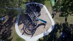 [video: the camera pans the structure as children climb on ropes and belt climbers and the curved post of the structure. Camera switches to a view up through a tightly woven net as children climb all over. Camera switches to a slightly elevated view of one of the curves of the structure with the evenly space belted steps. The camera pans around the curve as children play on the belted steps and transfer to the other rope climbers and net climbers. View switches to a panning away bird’s eye view fulling showing the unique figure eight shape of the play structure. Children play all over the structure. Scene switches as boy runs and jumps from belt step to belt step around the curve of the structure. Scene switches to a view through the long “U” shaped hanging belt loop steps as a boy swings back and forth on the last step. Scene switches as a boy swings from a curved hand hold on the top curve of the structure. Camera switches to an overhead panning view of the play structure. A large group of children play all over the structure. Scene switches to a woman as she speaks to someone off camera with the play structure blurred in the background. White text slides into the lower left corner of the screen reading: Pauline Repp, Mayor, Port Heron Michigan.]