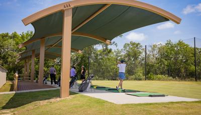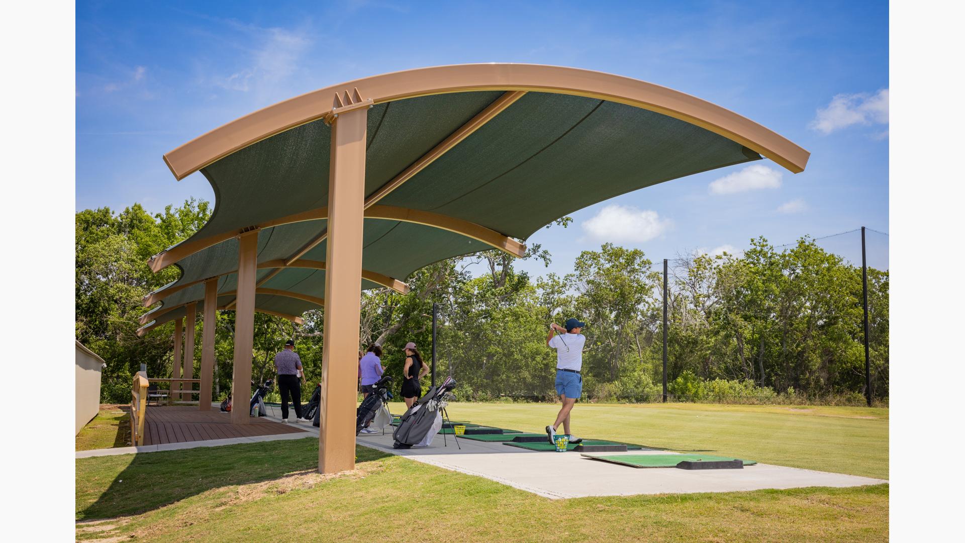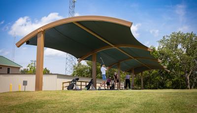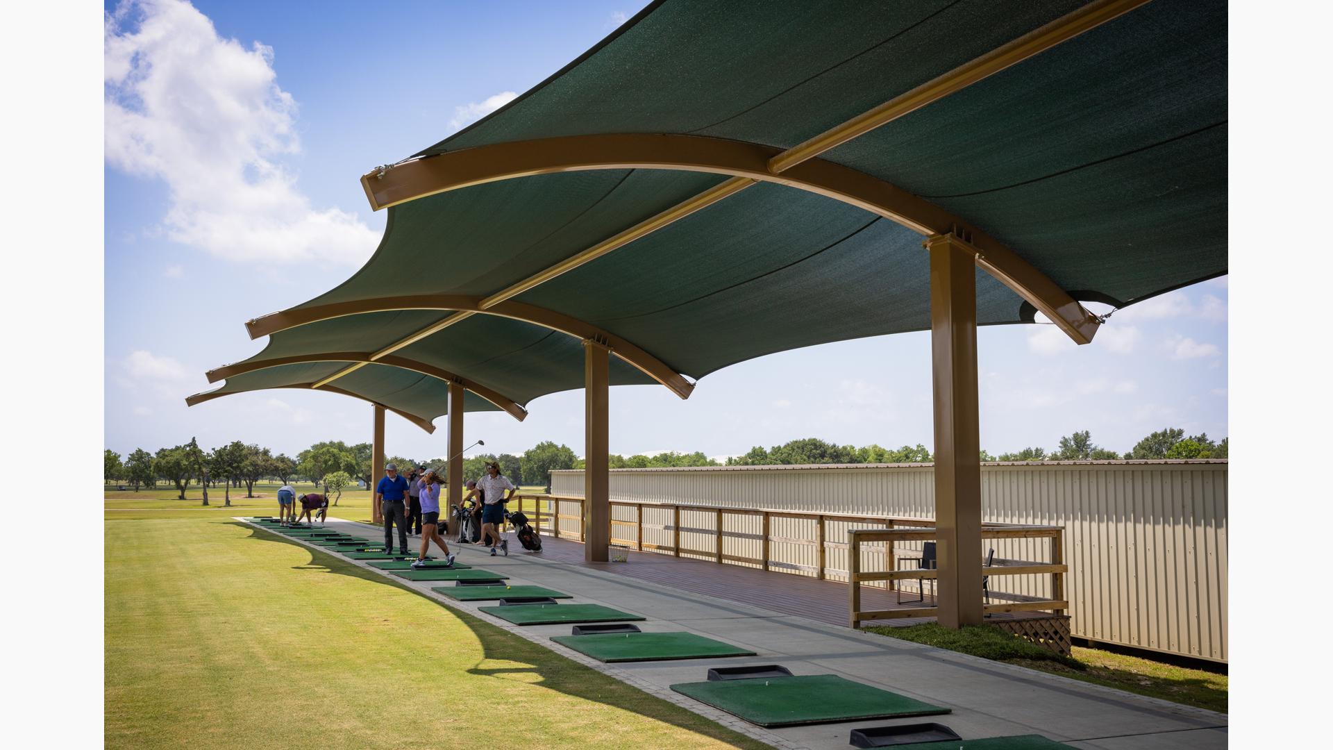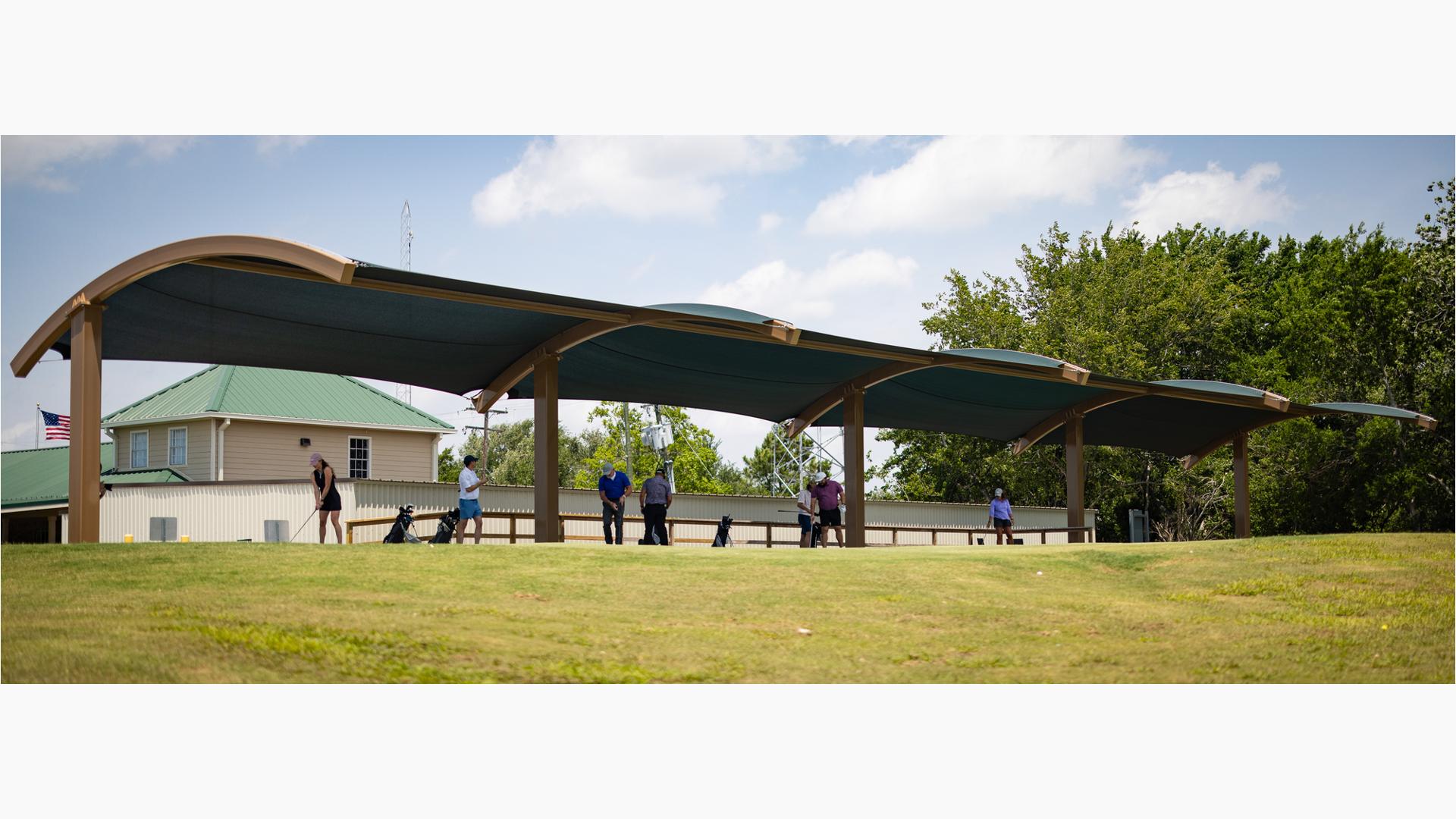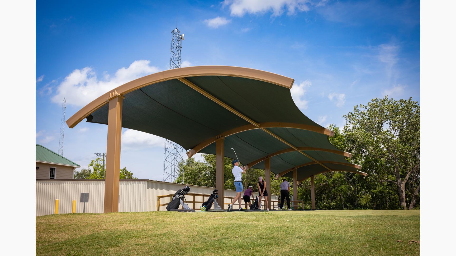 Golfers can stay cool while practicing their drive under this custom SkyWays® shade structure at the Pasadena Municipal Golf Course driving range in Houston, Texas. The deep green, joined-barrel cantilever shade structure—designed specifically for the space—spans more than 140 feet long and 30 feet wide, giving golfers plenty of room to swing in comfort and bystanders space to observe. SkyWays shades keep areas up to 30 degrees cooler and block 97% of UV rays, so visitors are protected even on the sunniest days.
