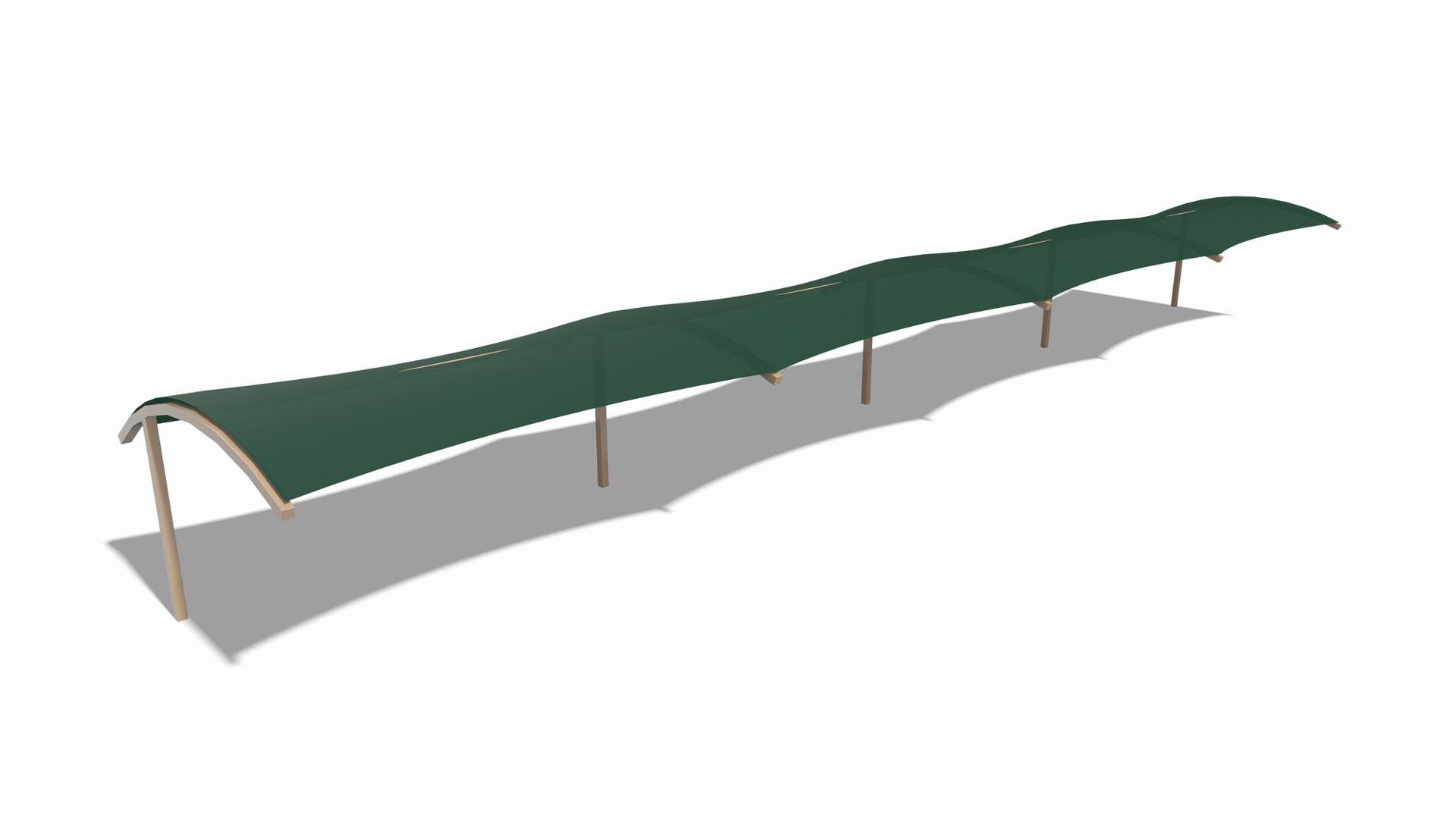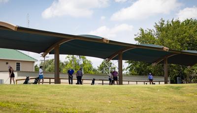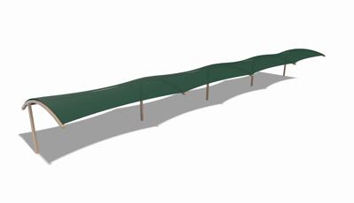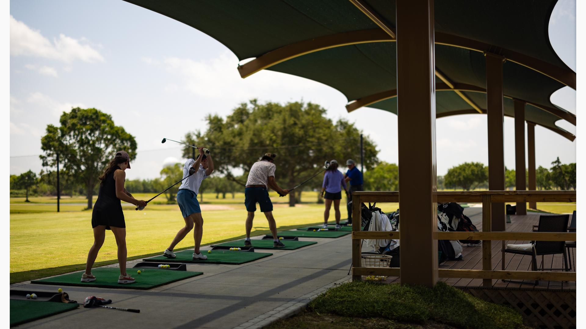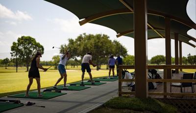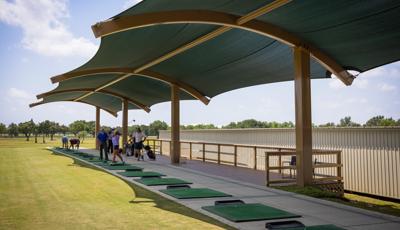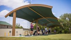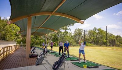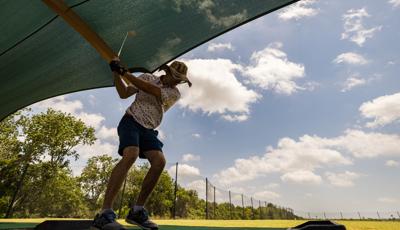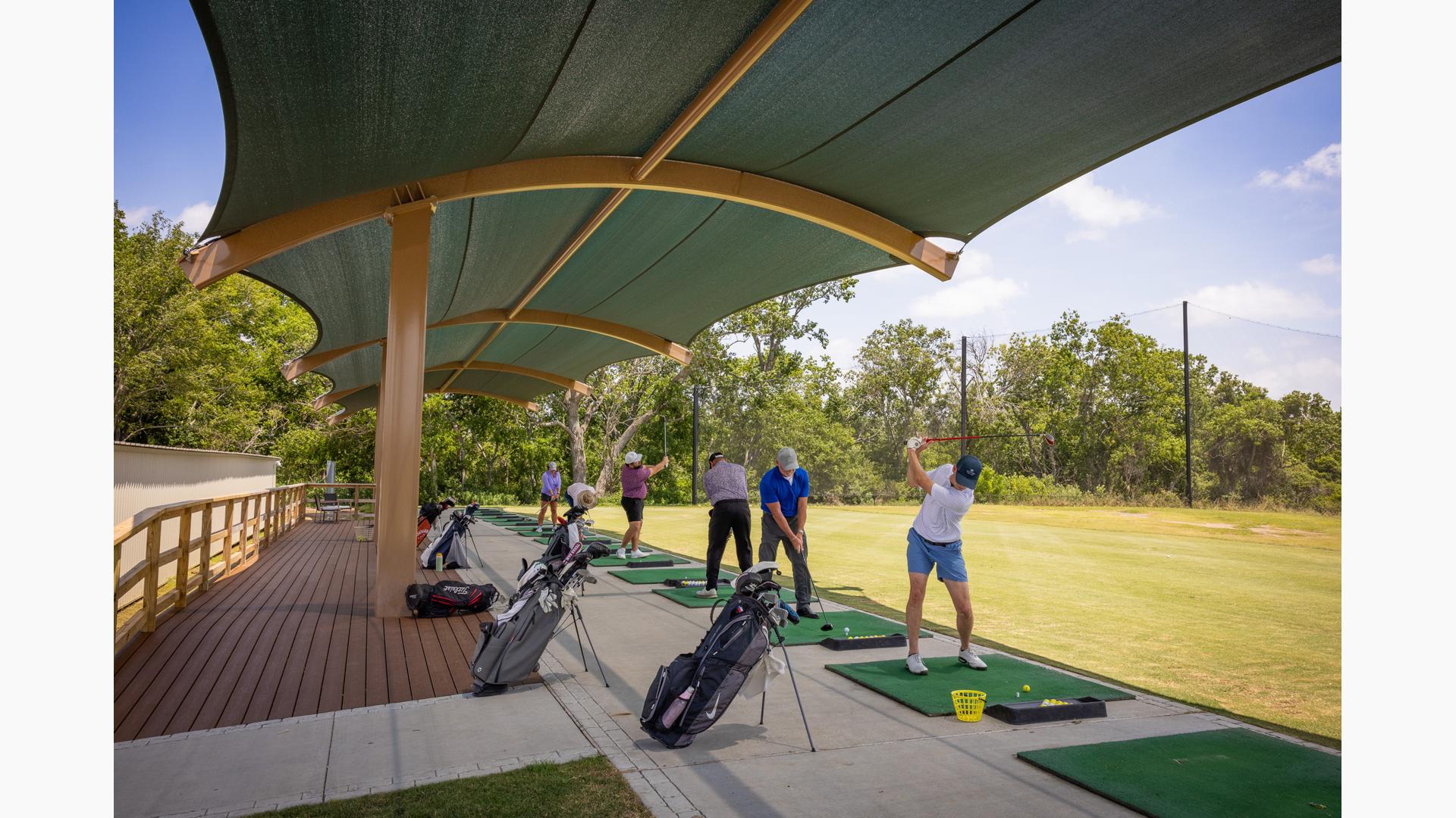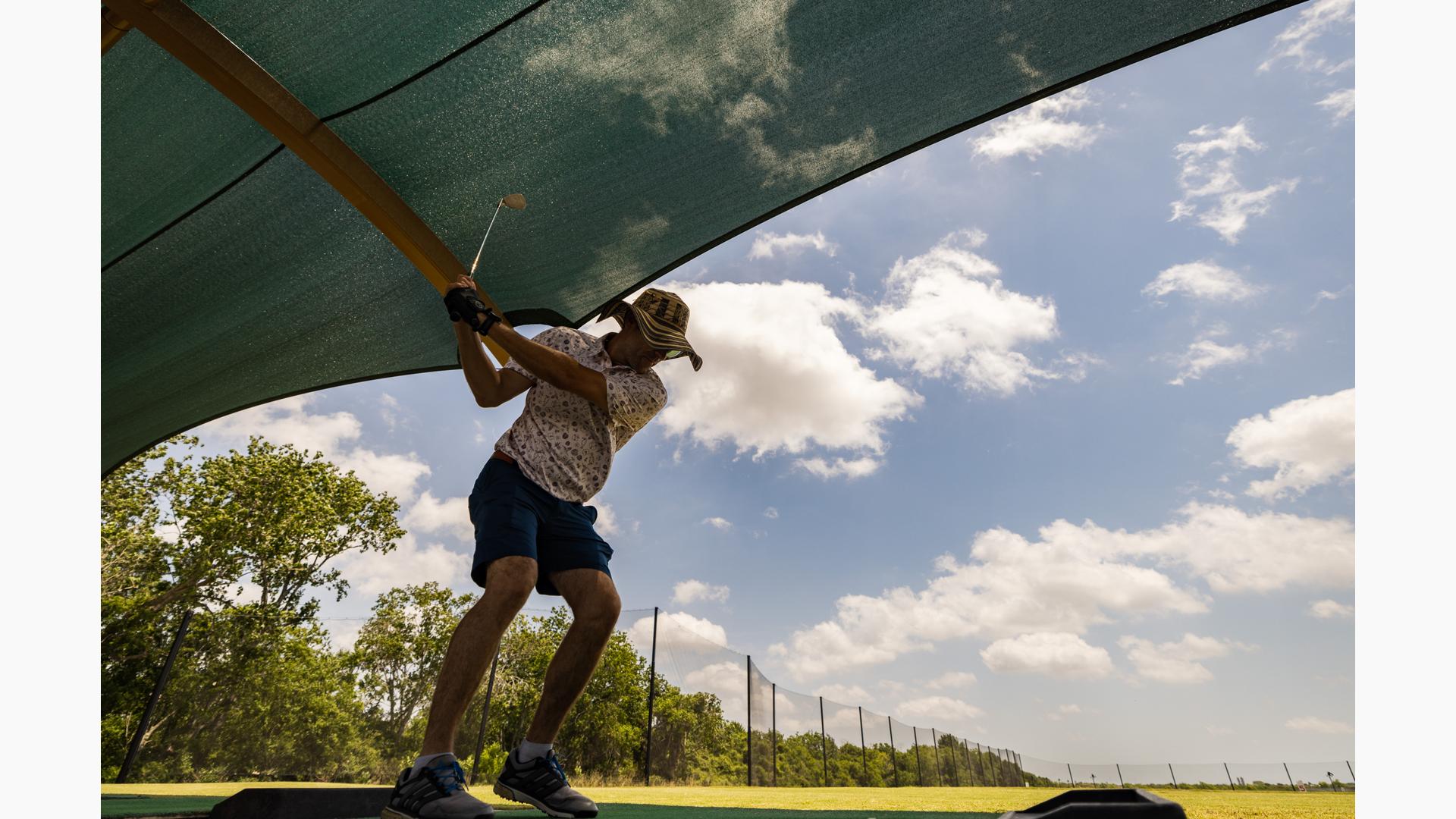 Golfers can stay cool while practicing their drive under this custom SkyWays® shade structure at the Pasadena Municipal Golf Course driving range in Houston, Texas. The deep green, joined-barrel cantilever shade structure—designed specifically for the space—spans more than 140 feet long and 30 feet wide, giving golfers plenty of room to swing in comfort and bystanders space to observe. SkyWays shades keep areas up to 30 degrees cooler and block 97% of UV rays, so visitors are protected even on the sunniest days.