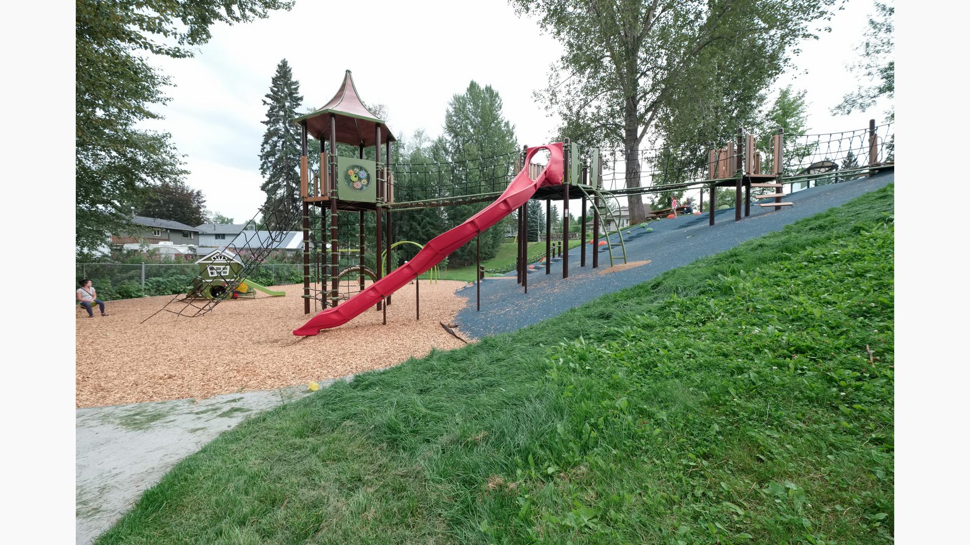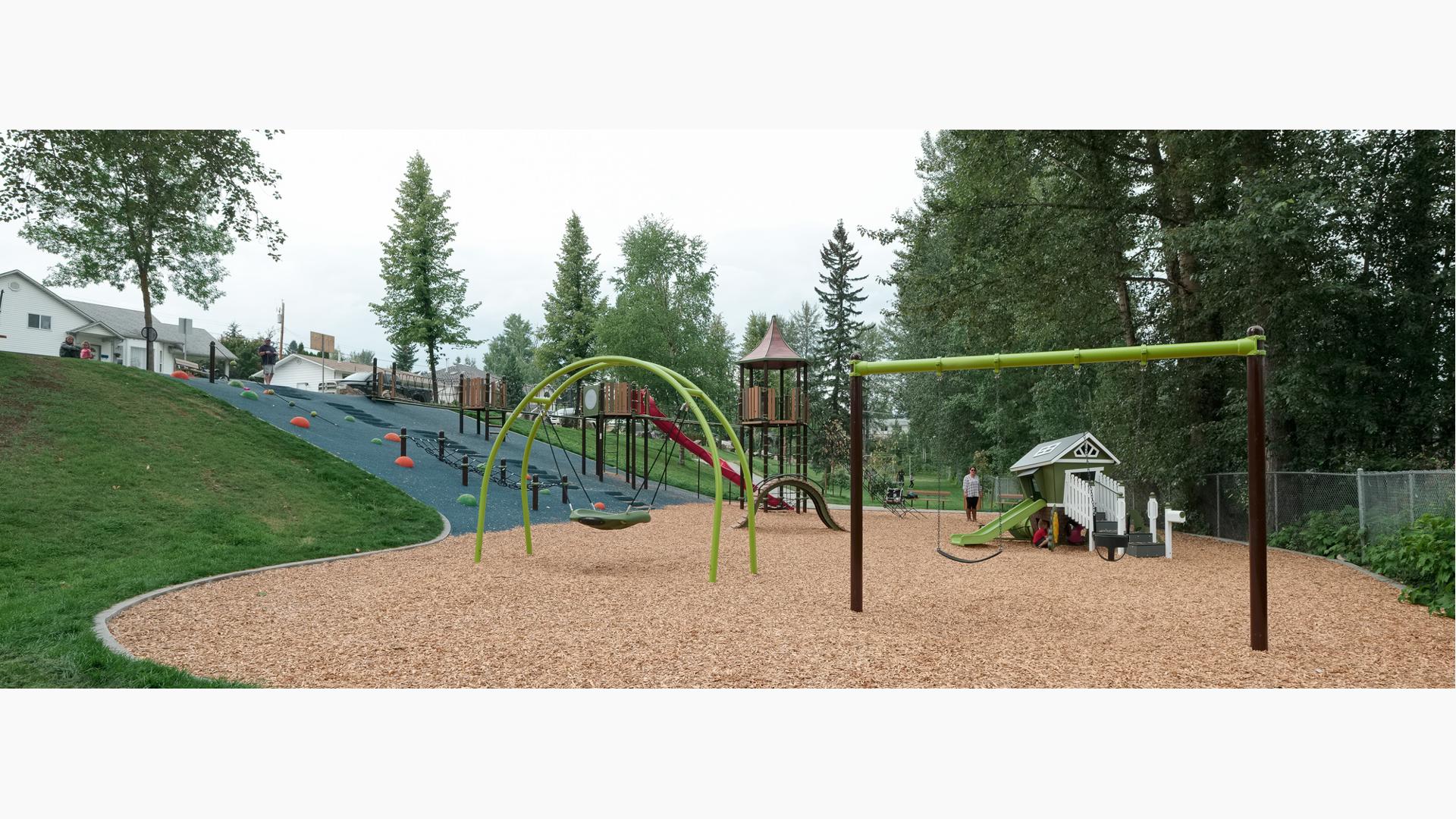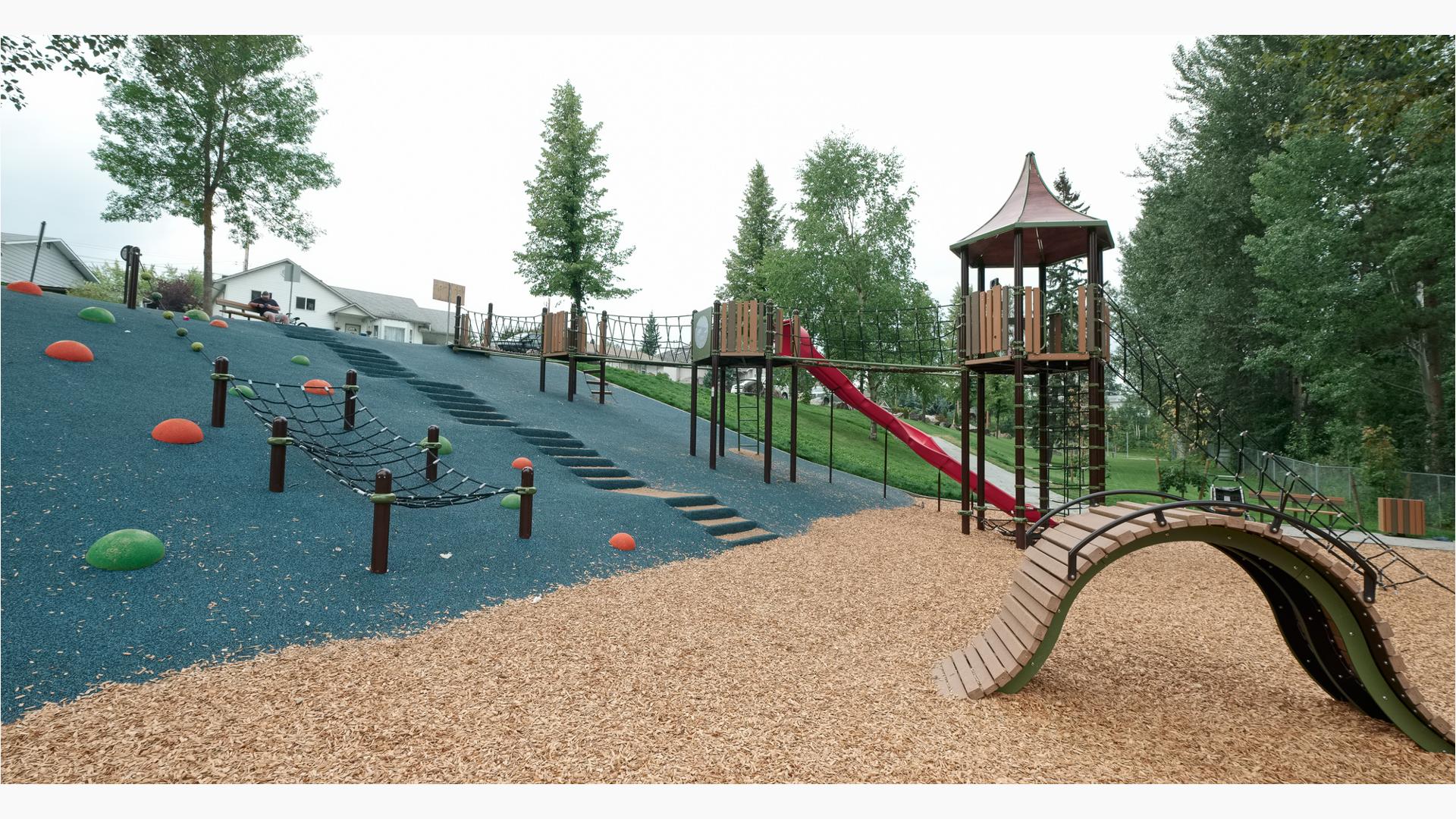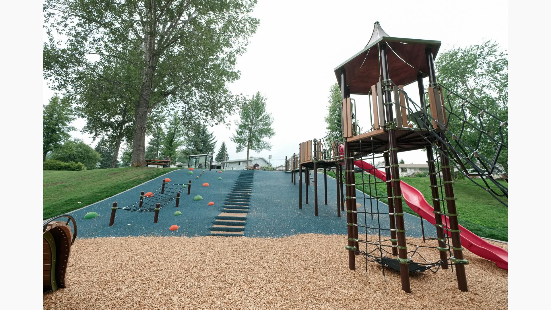 The design at Patchett Street Playground took advantage of the existing topography to create a fun and unique play experience. From the top of the hill, users can enter the playground structure and access the slide and tower from there. Or kids ages 5 to 12, and navigate up the playground net climbers to reach the top of the playground tower. Additionally, climbers and other play experiences are built right into the side of the hill. Even more, Loft was included for kids ages 2 to 5 along with freestanding spinners, climbers and playground swings.