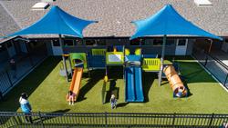 [video: scene fades into a full elevated view of a church building amongst a neighborhood. Fenced in play areas surround the church. A white arrow with text appears and points one play area reading “2-5 Play Area. A second white arrow and text points to a second play area reading “5-12 Play Area”. Scene switches to two boys as they slide down a dual landed slide. Parents shout off camera with excitement as they ride to the bottom of the slide. Camera switches to a view from the top of the slide as a child rides down. Scene switches to a top-down view of a single slide as a girl rides down. Two boys stand and play at a periscope panel. The to boys sit at the top of the dual laned slide holding hands. They slide down together as their parents cheer them on. Scene switches to an elevated rotating view around the five to twelve play area. A boy climbs up behind a girl on a curved hill shaped climber. The camera focuses on a young boy sitting at the bottom of a slanted craw tunnel. Scene switches to a full bird’s eye view of the two play areas next to the church building along with a separate basketball court area to the left. Scene switches to a view of the two to five play area where the camera focuses on different play panels. Camera switches to a full elevated view of the two to five play area. Children giggle and play on the play structure. Two boys use the looped hand holds to step up and down the playground decking. A boy kneels at mirror play panel. He presses is face close to mirror looking at himself. A girl walks up the multi-level playground decking. A boy rides down the dual laned side before his brother can sit down at the top. Camera switches to a rotating view of the two to five play area. Scene fades out and back into a girl sitting at the bottom of a slanted crawl tunnel. A mother helps to put a headband on her daughter standing nearby. Scene fades out and back into a girl as she waves in slow motion towards the camera. Screen jumps to white. A black vertical line appears in the center of the screen. Ross Recreation Equipment logo slides out to the right of the line. Then the Landscape Structures logo slides out to the left of the line. Text fades in below both logos reading: For a better tomorrow we play today. Screen fades to black and video ends.]