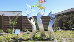 [video: scene fades into a ground view up to the side of a brick building with blue letter signage reading “Positive Tomorrows”. A large blue star sits to the right of the lettering along with three scattered gold stars. Scene switches to a green garden with three silver metal human shaped statues holding up a flock of flying birds colored like the different colors of the rainbow. Scene switches to the entrance of a building with a concrete courtyard. Four separate concrete benches with wood planked tops are scattered throughout the courtyard. On each side of every bench is a different word in different colors. One reads “confidence”, “hope”, “self-control”, and “creativity”. The camera focuses on two of the benches on with the word “creativity” with a silver plaque below reading “Katie Cunningham Hass”. And the second bench reading “self-control” with a sliver plaque below reading “Porter Cunningham”. Scene fades to black and back into a full panning elevating view of a school playground filled with children.]