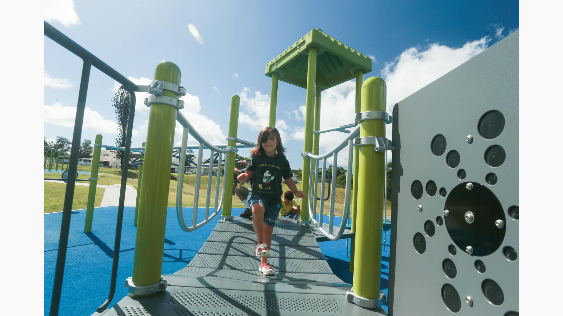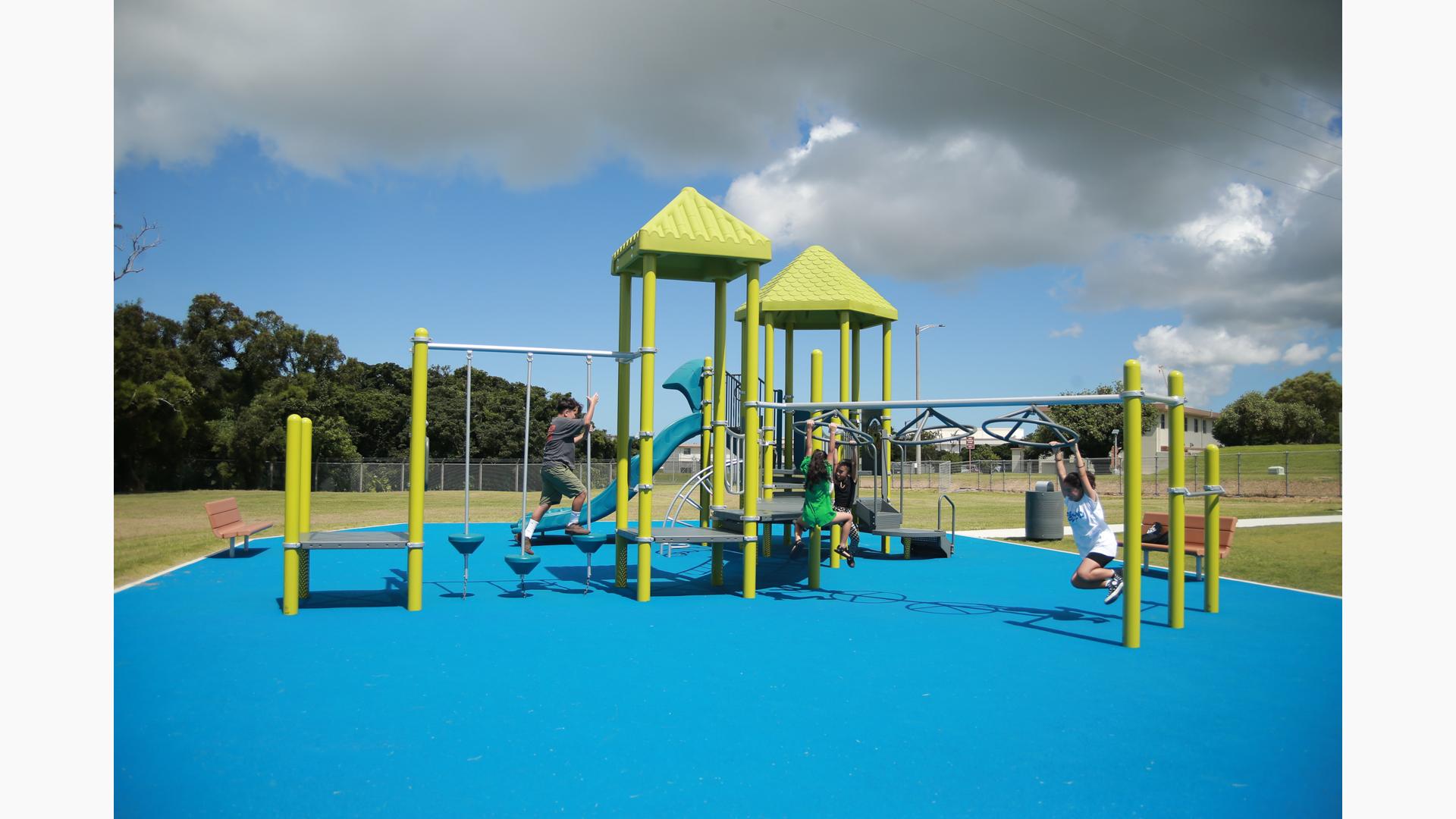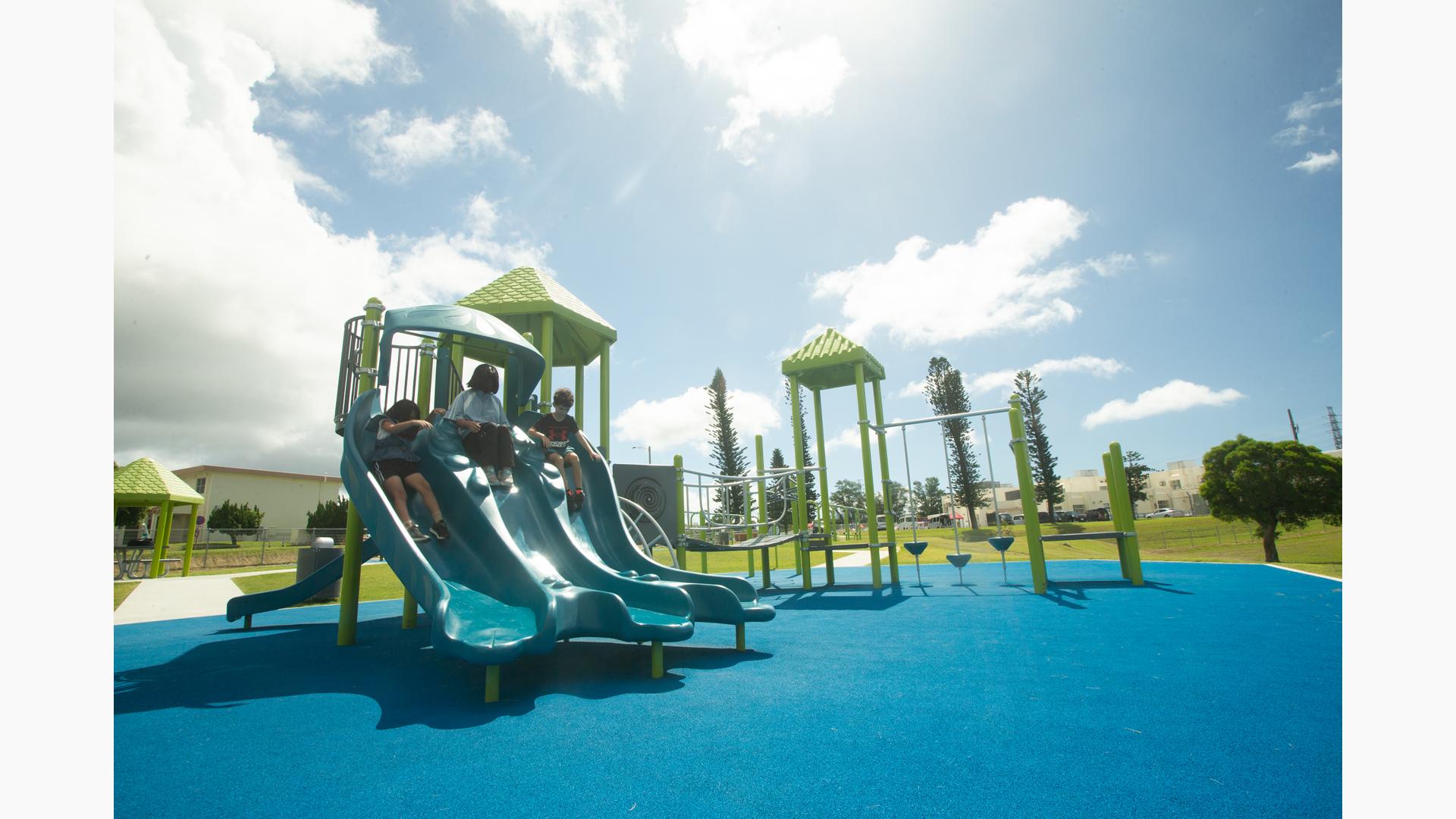 Contact Your ConsultantStudents at Ralph F. Stearley Primary School have numerous choices for play at this engaging and multifaceted school playground for ages 5 to 12 in Okinawa, Japan. Two separate PlayBooster® mainstructures connected by a roofed seating area provide fun options for climbing, sliding, balancing and overhead play. Nearby, a multiple-bay swing set allows numerous children to swing at one time. The area is finished with rubberized surfacing so that visitors with mobility devices can easily navigate the area and access the play events of their choice.