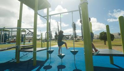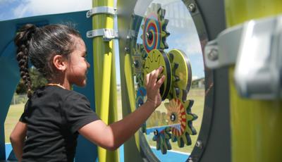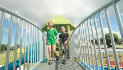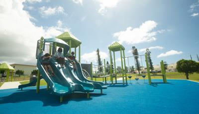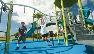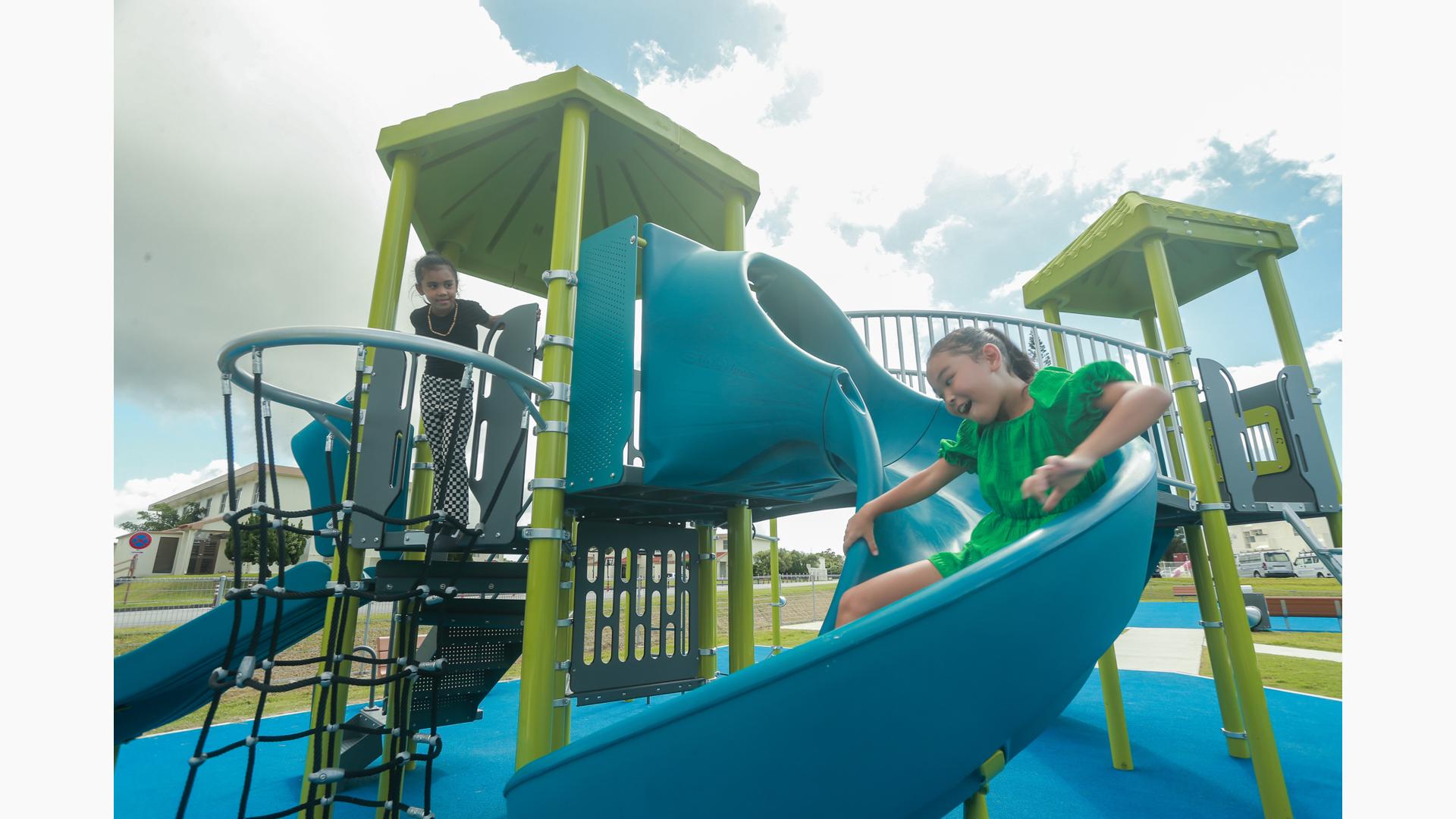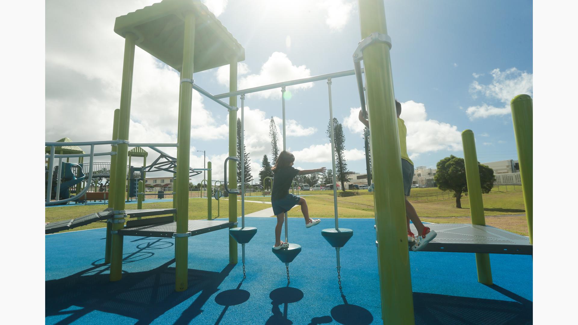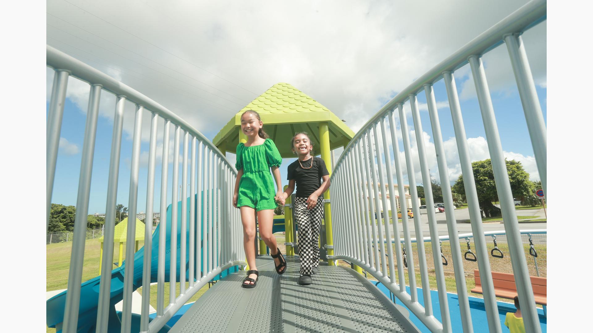 Contact Your ConsultantStudents at Ralph F. Stearley Primary School have numerous choices for play at this engaging and multifaceted school playground for ages 5 to 12 in Okinawa, Japan. Two separate PlayBooster® mainstructures connected by a roofed seating area provide fun options for climbing, sliding, balancing and overhead play. Nearby, a multiple-bay swing set allows numerous children to swing at one time. The area is finished with rubberized surfacing so that visitors with mobility devices can easily navigate the area and access the play events of their choice.
