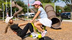 Contact Your ConsultantChildren of all ages will have their choice of play opportunities at this friendly neighborhood park playground in Rosenberg, Texas. Children ages 2 to 5 will enjoy the PlayShaper® structure with sensory learning panels, a tunnel slide and climber, plus adjacent Bobble Riders™. Elementary-aged kids will flock to the PlayBooster® play structure featuring multiple slides, climbers, overhead events, and the thrilling Flywheel® Spinner. A swing set with two different seat types ensures that kids of all ages can enjoy the freedom of swinging. The lovely lakeside setting and natural color palette ensure that River’s Run Park playground is a joyful destination for all.