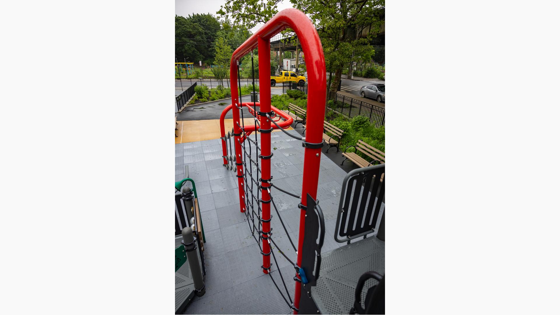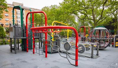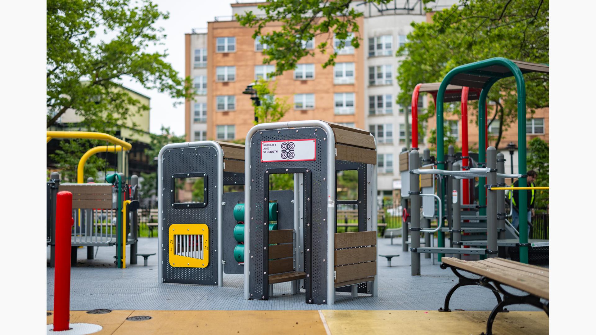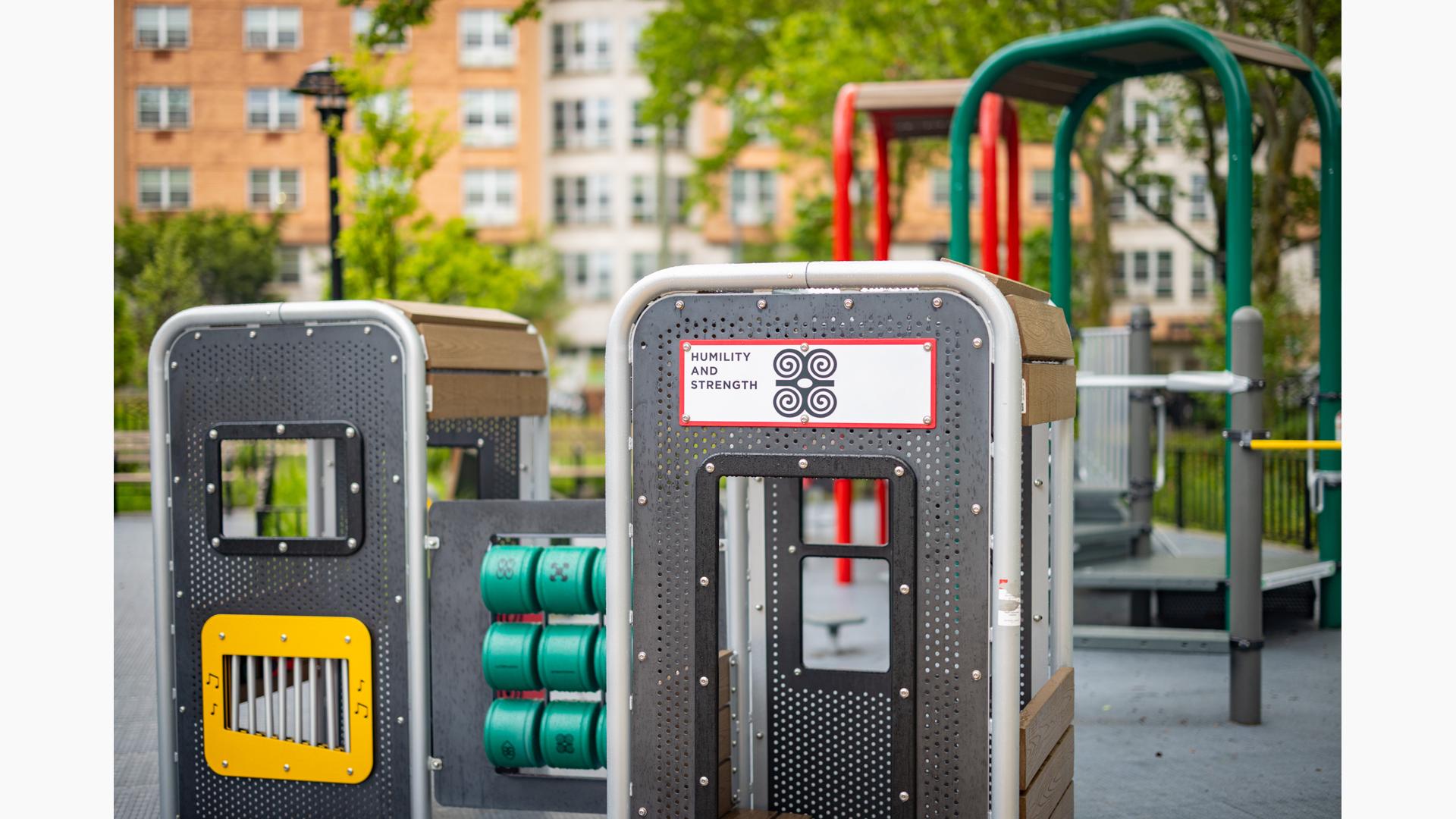 Design files are not available for this custom design. Contact your local playground consultant for additional details.Sankofa Park Playground in Brooklyn, New York, is a celebration of African American history as well as a gift to the local community of today. The name “Sankofa” references a mythic bird that flies into the future while keeping its beak turned toward the past, reflecting the connection between history and the present.