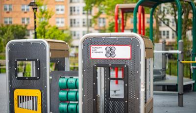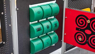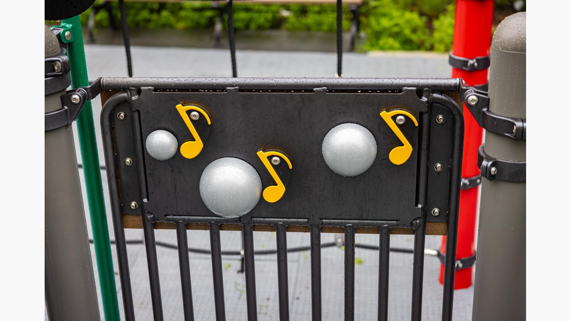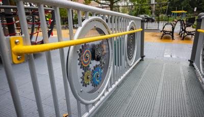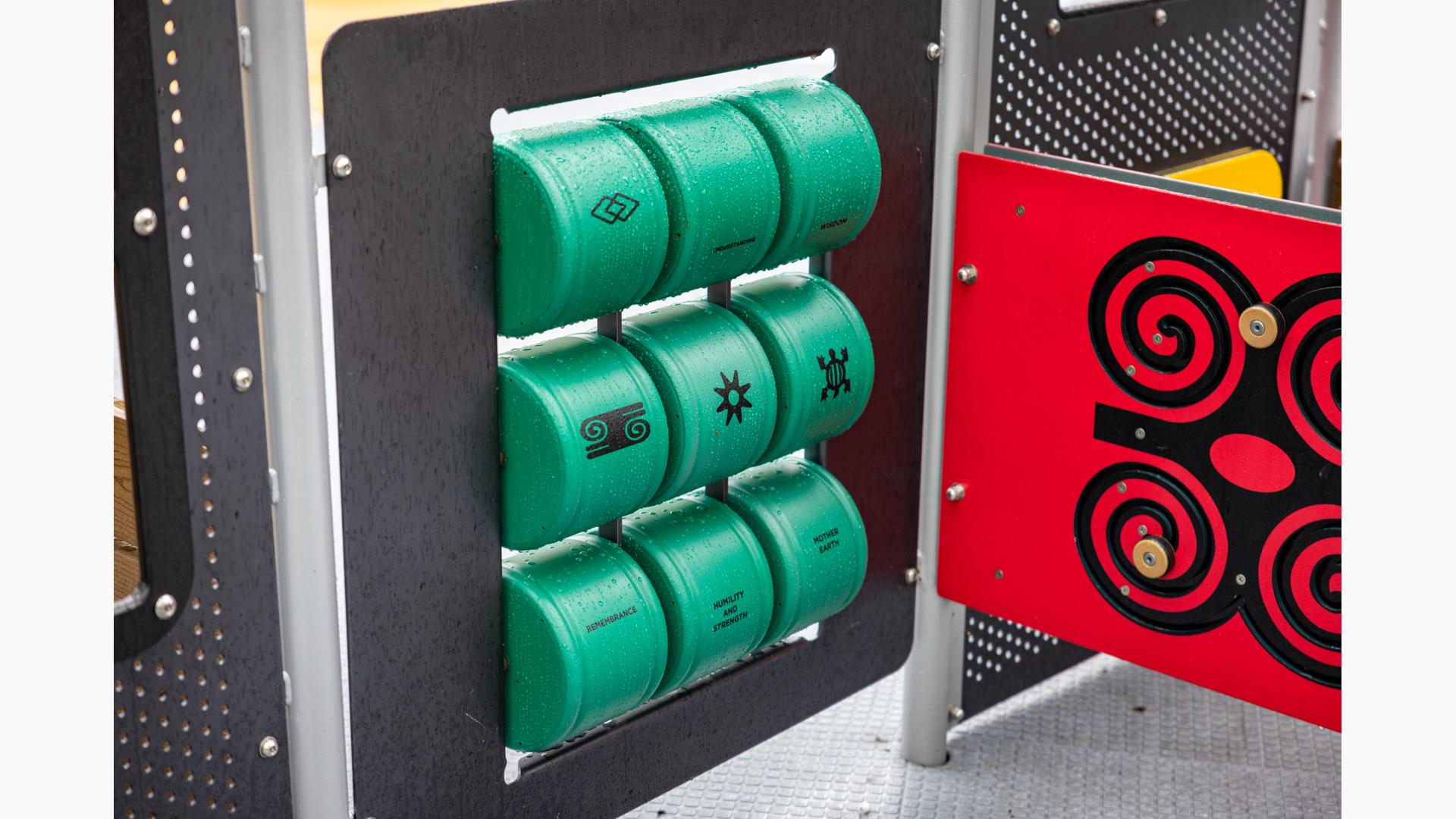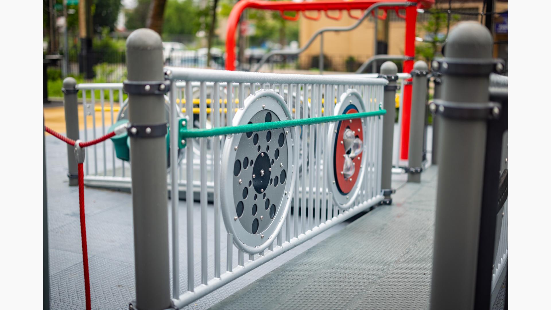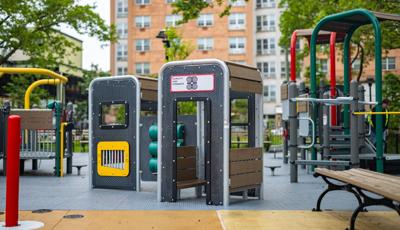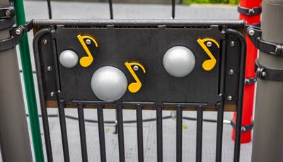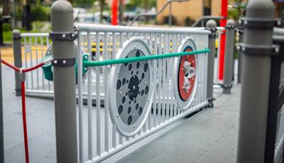 The playground brings that history to life by featuring African cultural symbols alongside words like “Remembrance” and “Strength.” Colored in a palette of red, green and yellow, the space features rectangular archways that suggest connection and togetherness. For children ages 5 to 12, climbers of varying styles and materials, overhead events and sensory panels are linked by accessible ramps and bridges, ensuring children using mobility devices can play freely. For preschoolers, two cubical playhouses connected by learning panels create a welcoming space where imagination can thrive. At the center of it all, an inclusive Global Motion® multi-user spinner invites kids to come together for a thrilling ride.