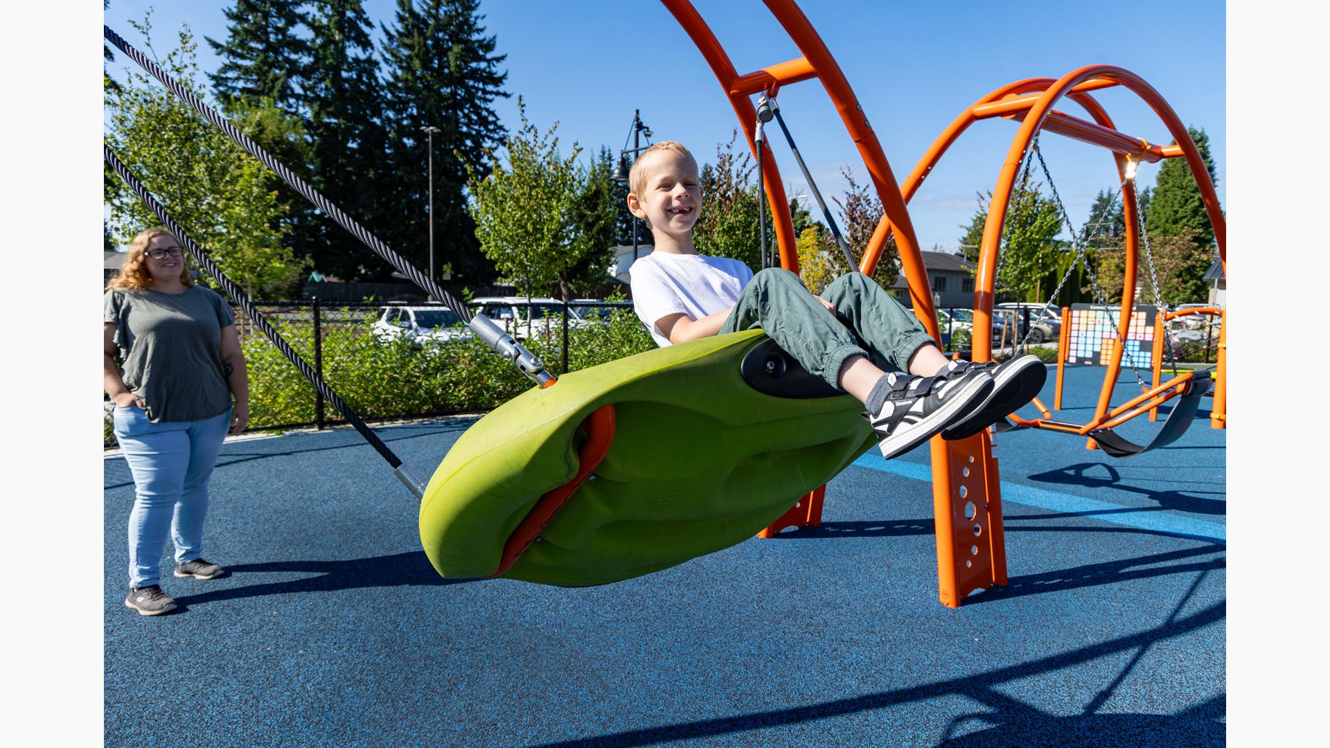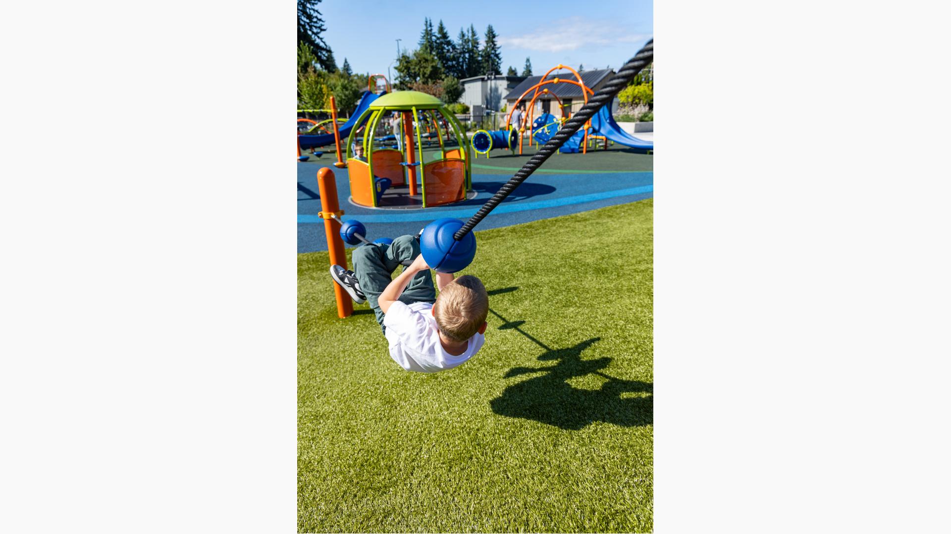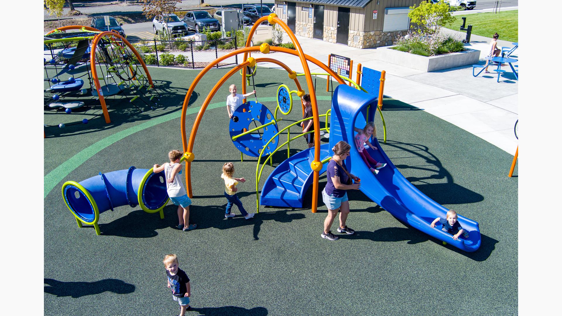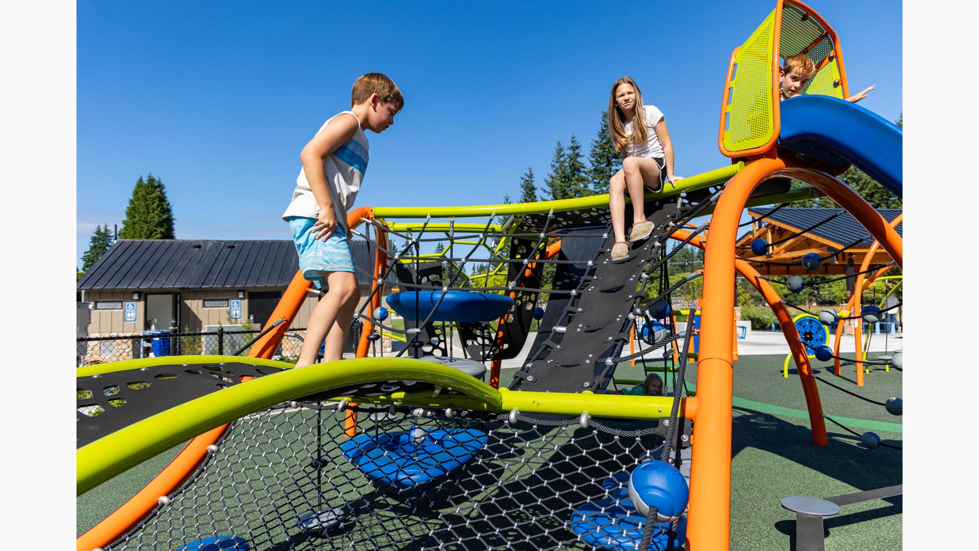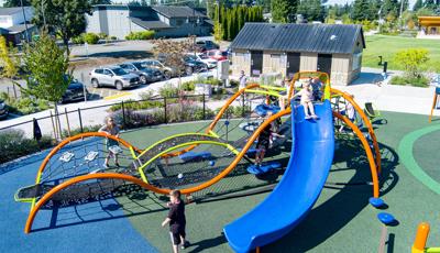Contact Your ConsultantThe playground at Smokey Point Community Park is a celebration of shapes and colors. A custom serpentine-shaped net climber with integrated Alpine® Slide is a magnet for children ages 5 to 12. Fun for kids ages 2 to 5 can be found on the elegantly arched Weevos® structures with Wee Planet™ Climber, slide and Wee Crawl® Tunnel. To one side of the play area, a natural slope has become inspiration for two slides and several climbing ropes, while motion can be enjoyed at ground level with the two-bay ZipKrooz® track ride. Kids looking for high-flying fun can jump on the multi-user Oodle® Swing or Friendship® Swing, and those who want to spin can find it on the inclusive We-Go-Round® next-generation spinner.