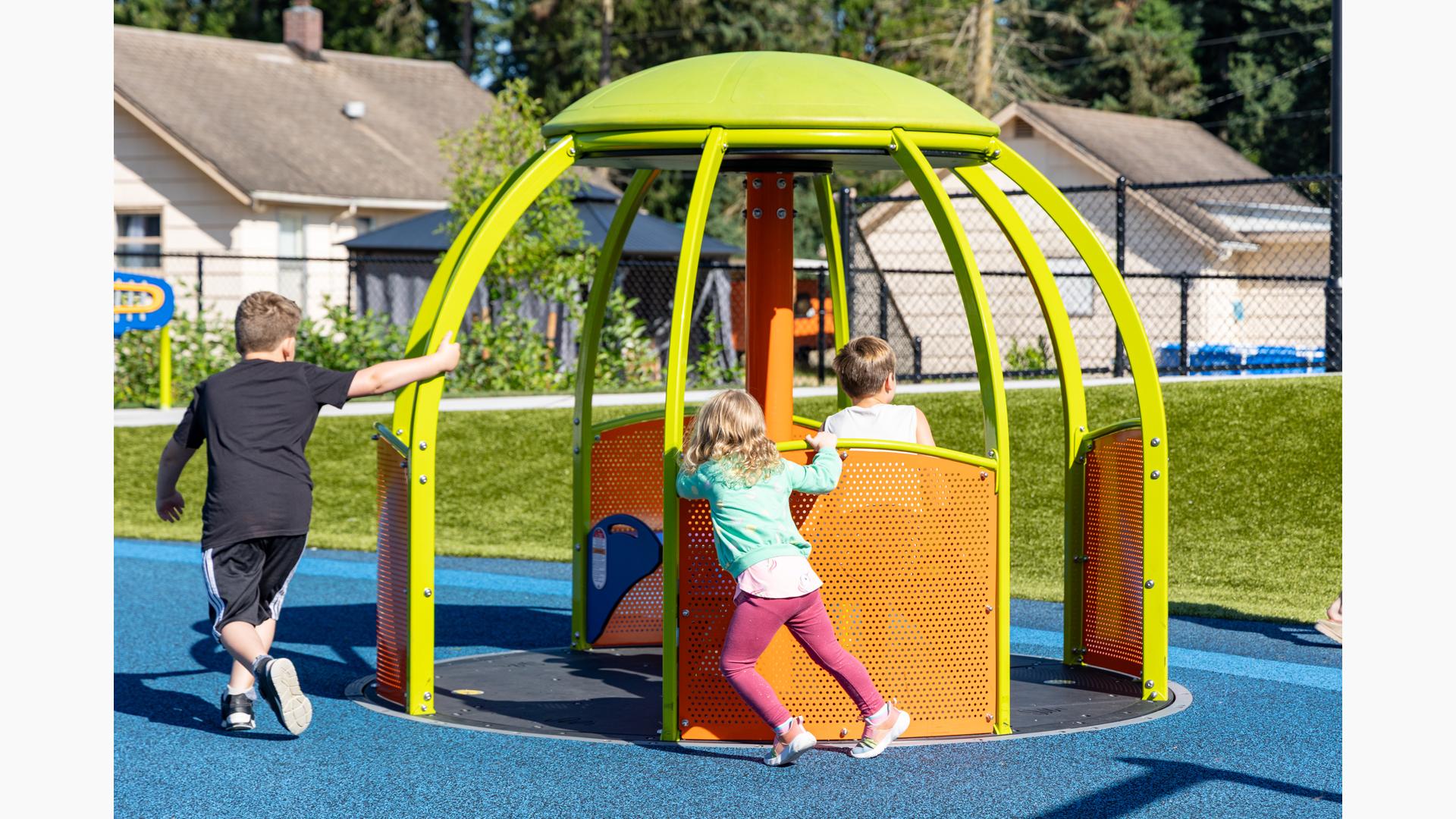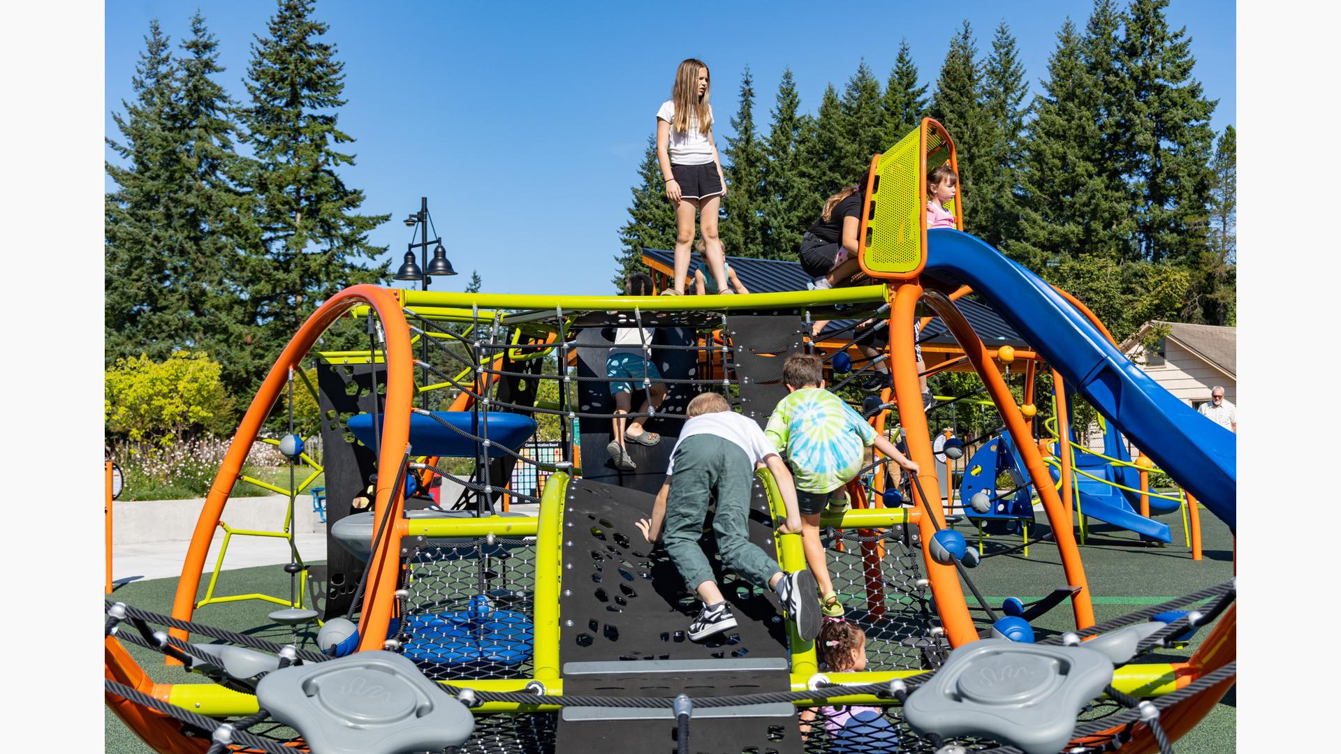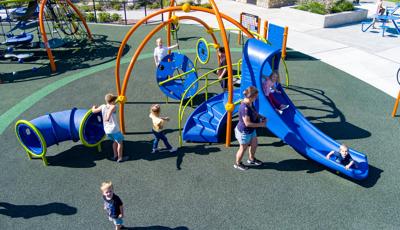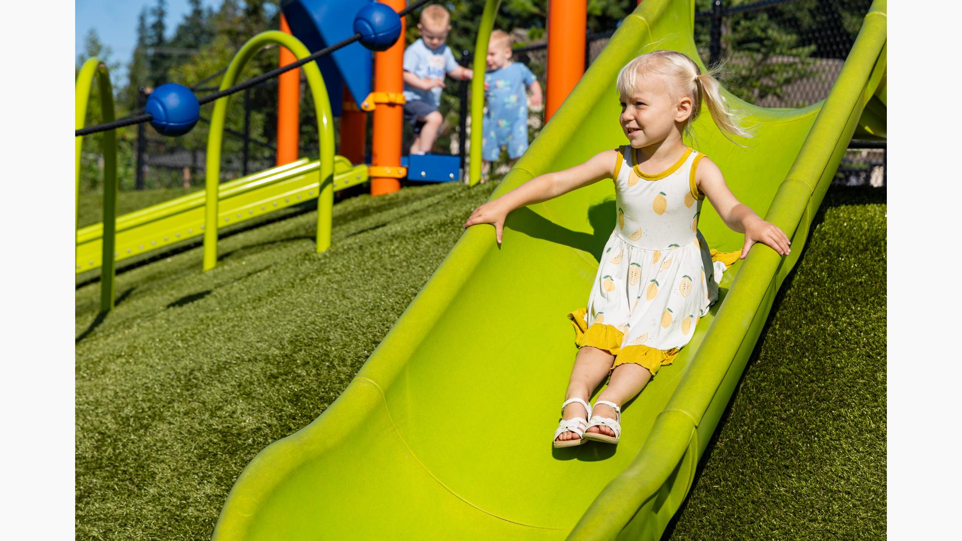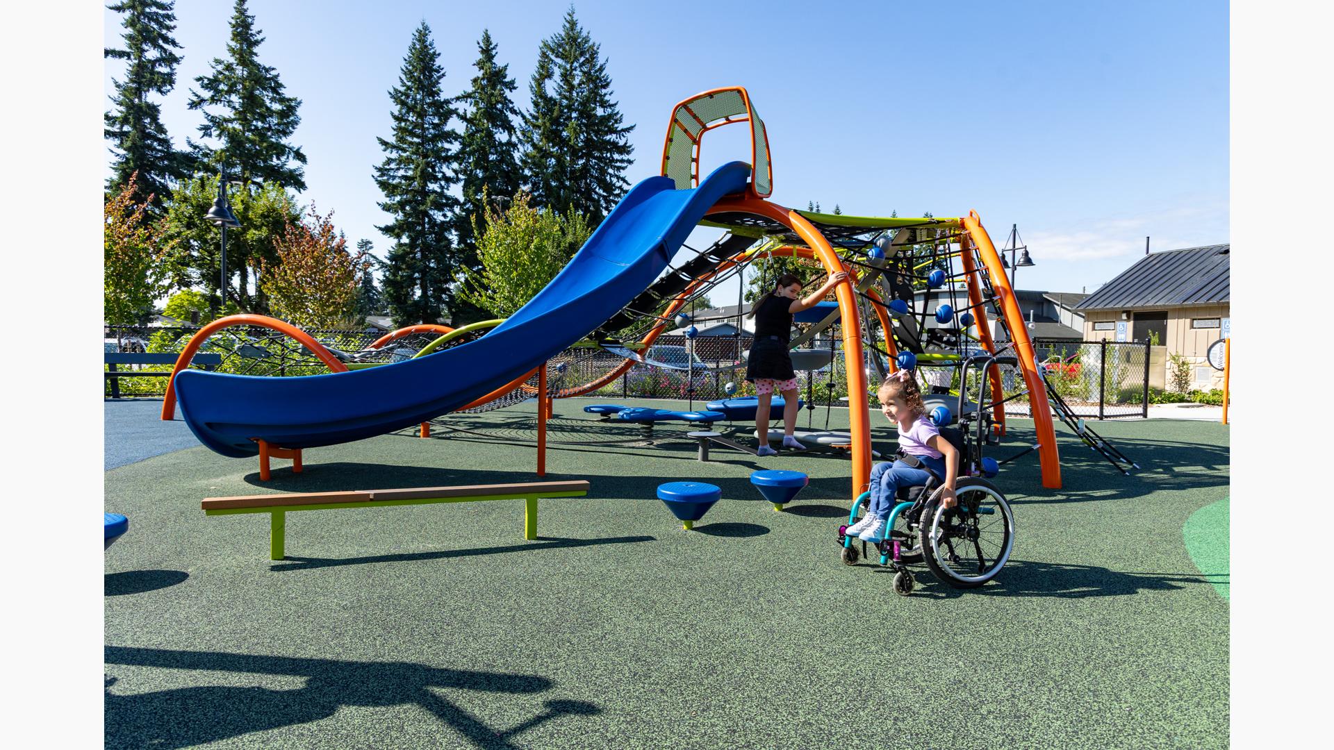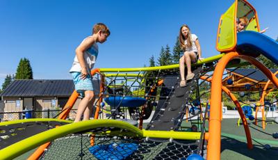 Contact Your ConsultantThe playground at Smokey Point Community Park is a celebration of shapes and colors. A custom serpentine-shaped net climber with integrated Alpine® Slide is a magnet for children ages 5 to 12. Fun for kids ages 2 to 5 can be found on the elegantly arched Weevos® structures with Wee Planet™ Climber, slide and Wee Crawl® Tunnel. To one side of the play area, a natural slope has become inspiration for two slides and several climbing ropes, while motion can be enjoyed at ground level with the two-bay ZipKrooz® track ride. Kids looking for high-flying fun can jump on the multi-user Oodle® Swing or Friendship® Swing, and those who want to spin can find it on the inclusive We-Go-Round® next-generation spinner.