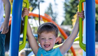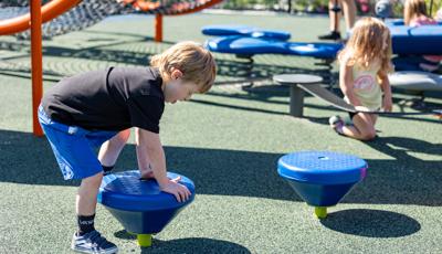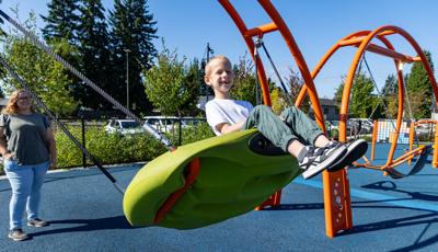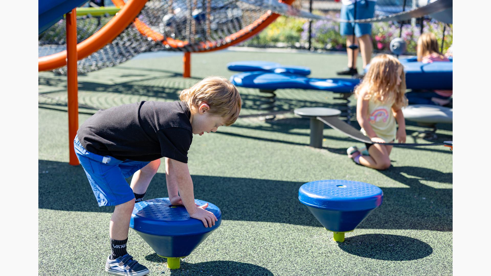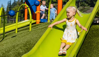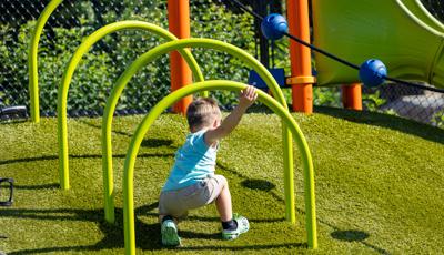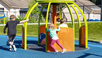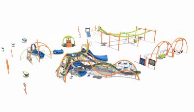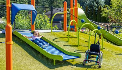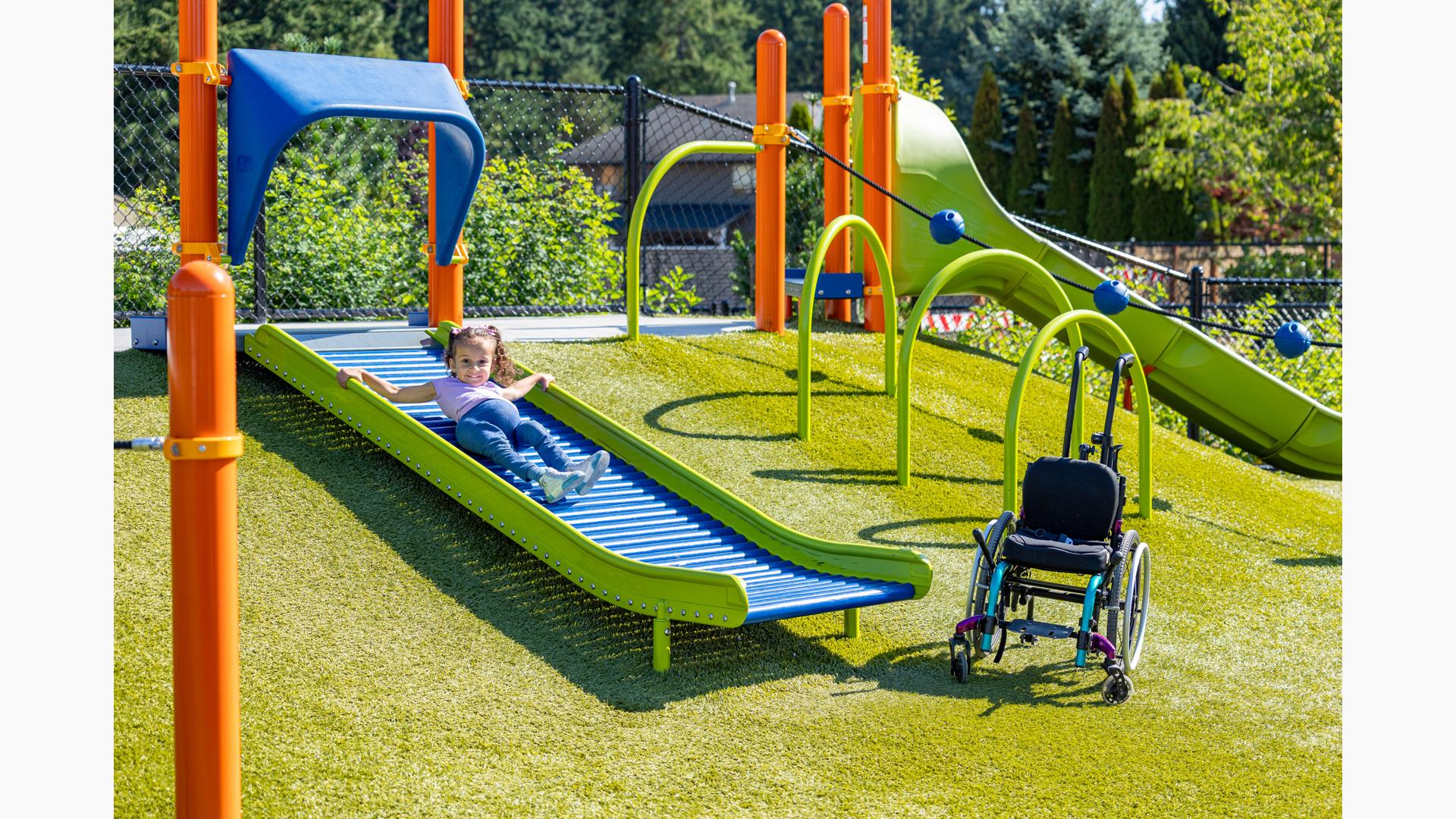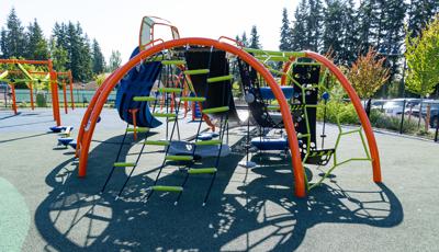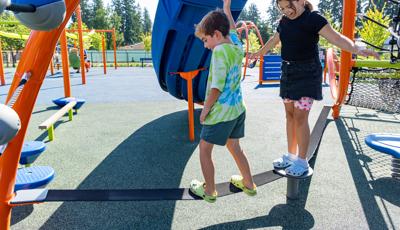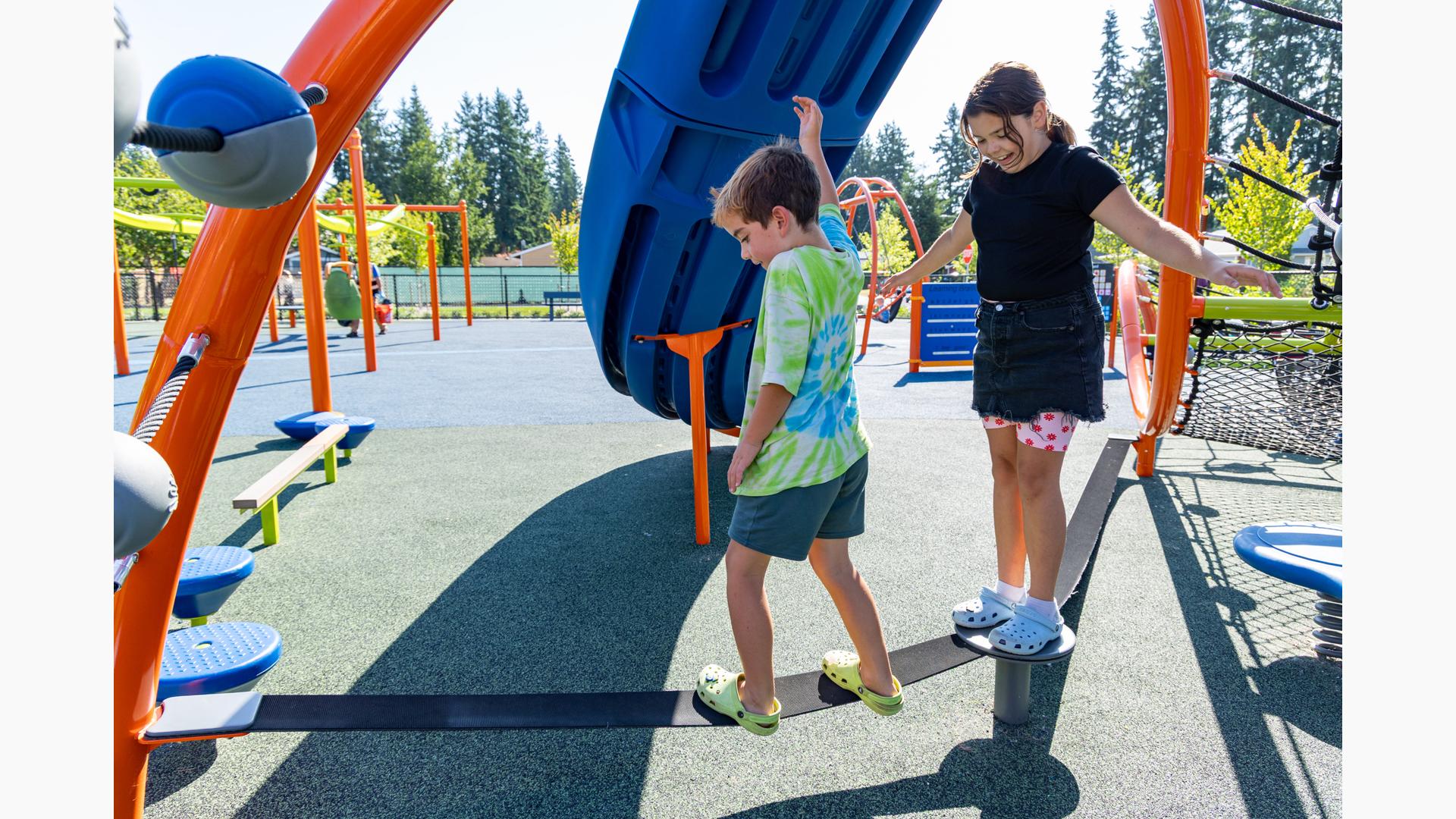 Contact Your ConsultantThe playground at Smokey Point Community Park is a celebration of shapes and colors. A custom serpentine-shaped net climber with integrated Alpine® Slide is a magnet for children ages 5 to 12. Fun for kids ages 2 to 5 can be found on the elegantly arched Weevos® structures with Wee Planet™ Climber, slide and Wee Crawl® Tunnel. To one side of the play area, a natural slope has become inspiration for two slides and several climbing ropes, while motion can be enjoyed at ground level with the two-bay ZipKrooz® track ride. Kids looking for high-flying fun can jump on the multi-user Oodle® Swing or Friendship® Swing, and those who want to spin can find it on the inclusive We-Go-Round® next-generation spinner.
