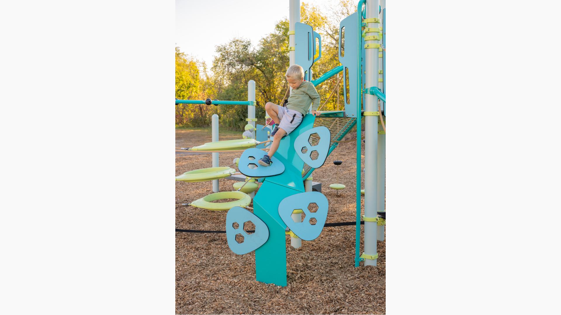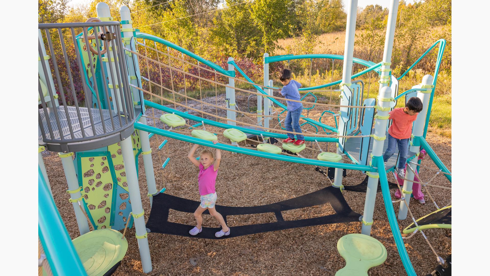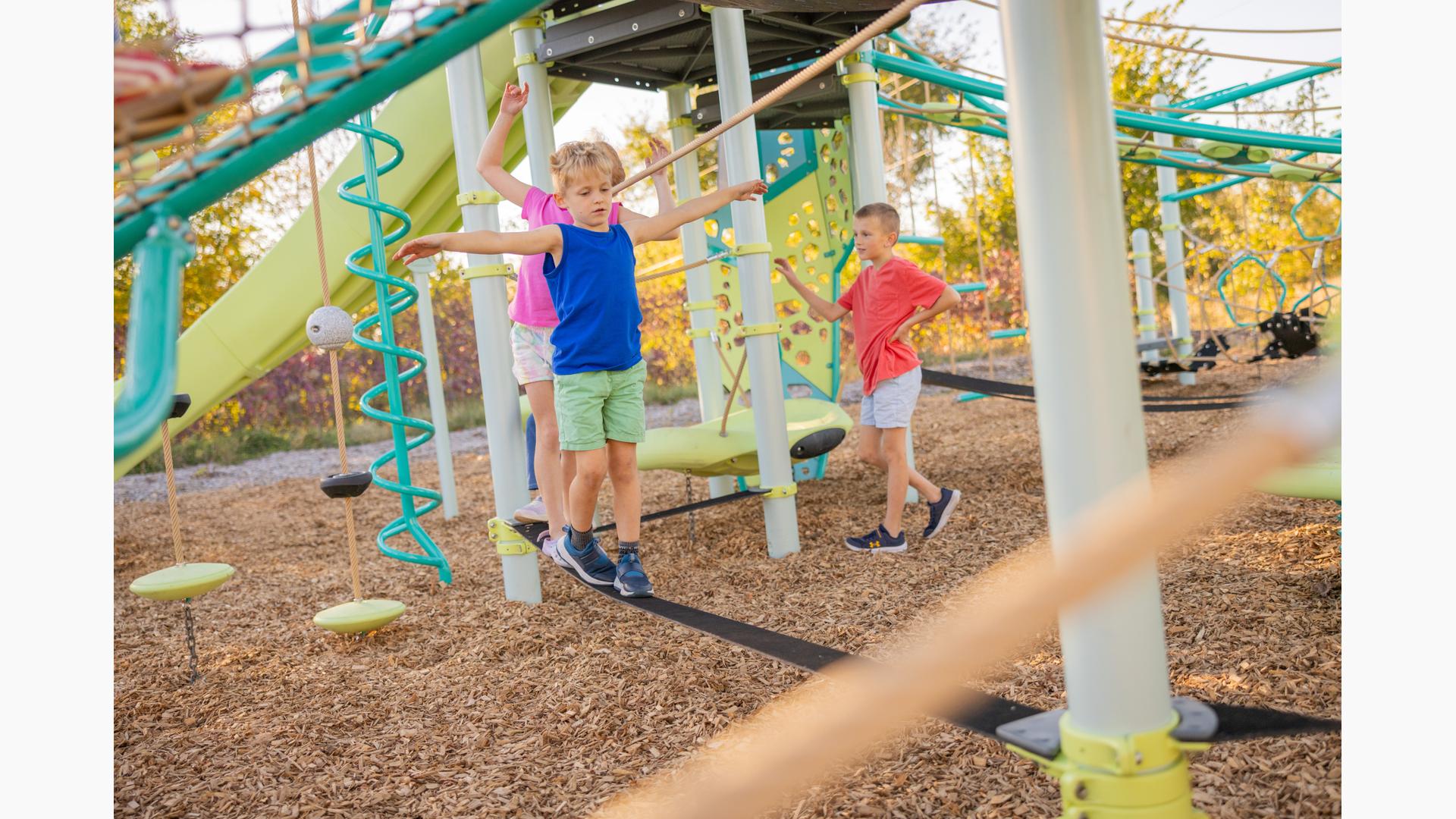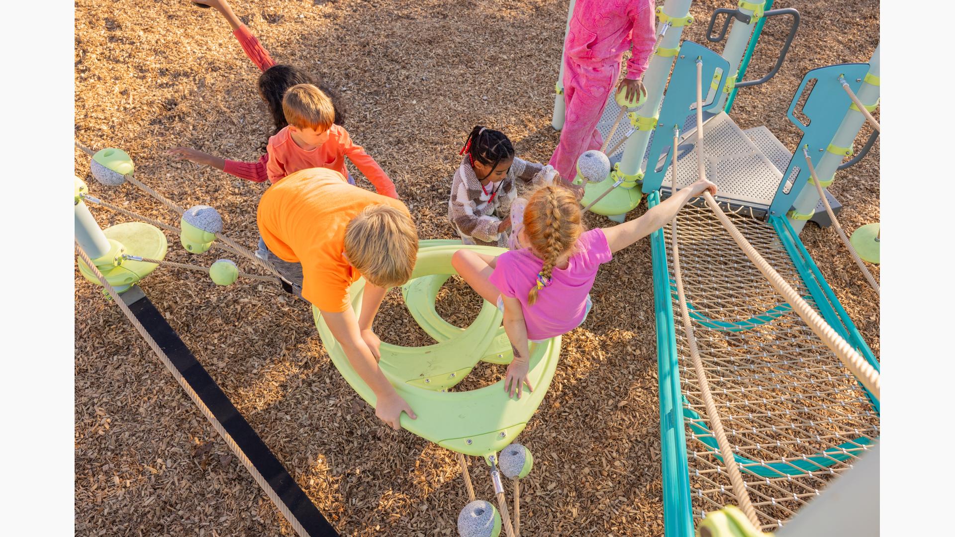 Spiral Grove wraps children in a continuous wave of movement, where curved slides, netted pathways and dynamic climbers create an immersive, multi-level adventure. Petal Canopies provide an organic, nature-inspired flourish, framing the space and inspiring the imagination. Kids navigate the connected activities of the playground via the entry point and path of their choice: scaling the Lotus™ Climber or the VertiGo™ Climber, crawling or stepping across the O-Zone® Array Climber. They might wobble along the Slack Line, or test coordination on the SwiggleKnots® Bridge Inclined. The PodHopper™, SaddleStep™ and BeltSwoop™ Climbers each challenge different abilities, though the journey may feel seamless and intuitive. Every climb, step or swoosh down the symmetrical FlowWinder™ and Alpine® Slides invites immersion in the three-dimensional flow.