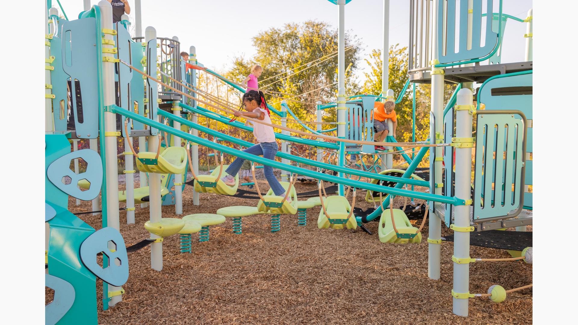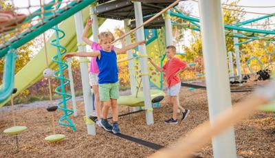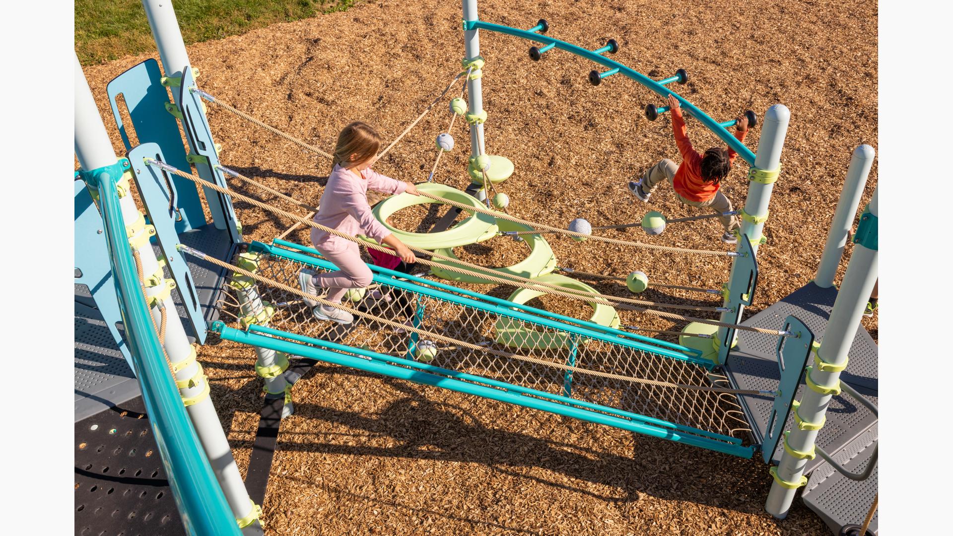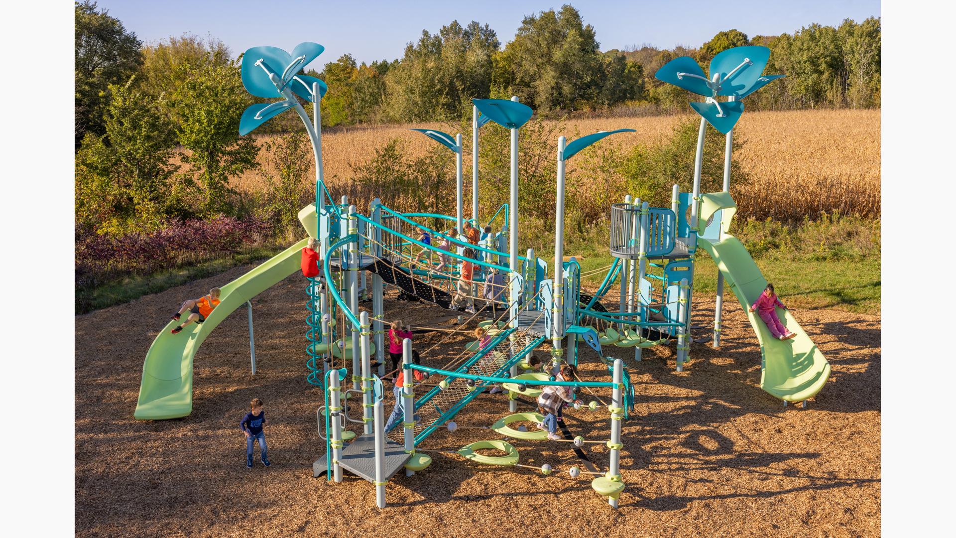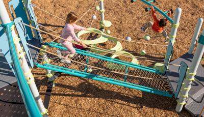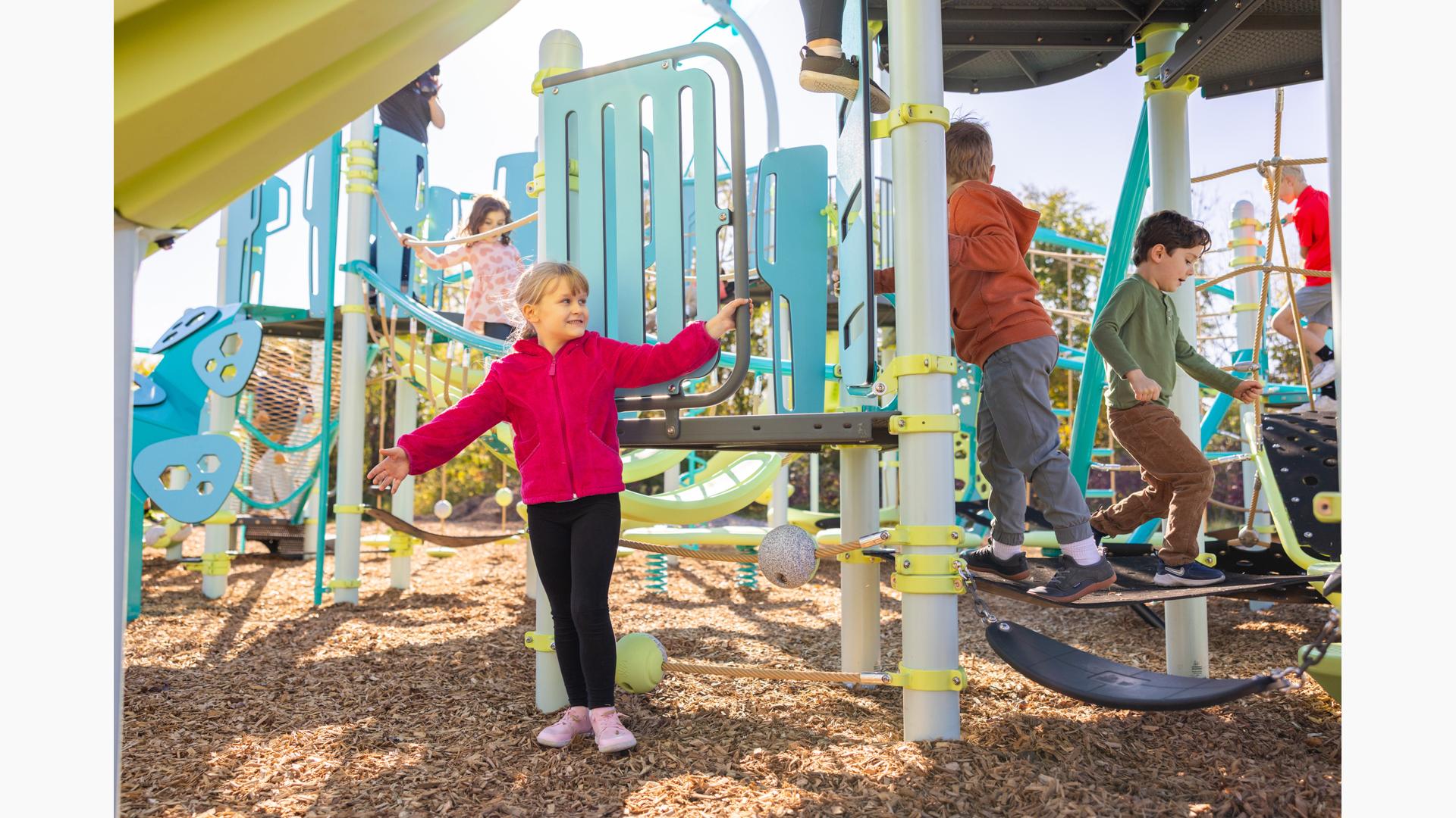 Spiral Grove wraps children in a continuous wave of movement, where curved slides, netted pathways and dynamic climbers create an immersive, multi-level adventure. Petal Canopies provide an organic, nature-inspired flourish, framing the space and inspiring the imagination. Kids navigate the connected activities of the playground via the entry point and path of their choice: scaling the Lotus™ Climber or the VertiGo™ Climber, crawling or stepping across the O-Zone® Array Climber. They might wobble along the Slack Line, or test coordination on the SwiggleKnots® Bridge Inclined. The PodHopper™, SaddleStep™ and BeltSwoop™ Climbers each challenge different abilities, though the journey may feel seamless and intuitive. Every climb, step or swoosh down the symmetrical FlowWinder™ and Alpine® Slides invites immersion in the three-dimensional flow.
