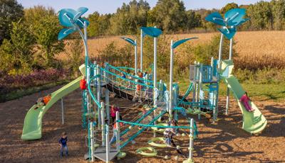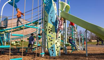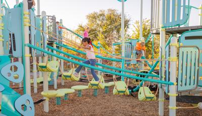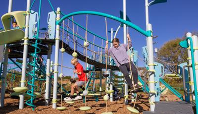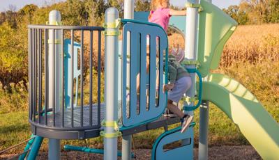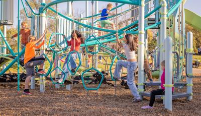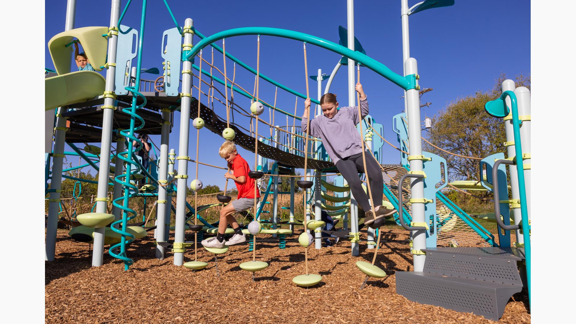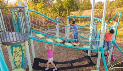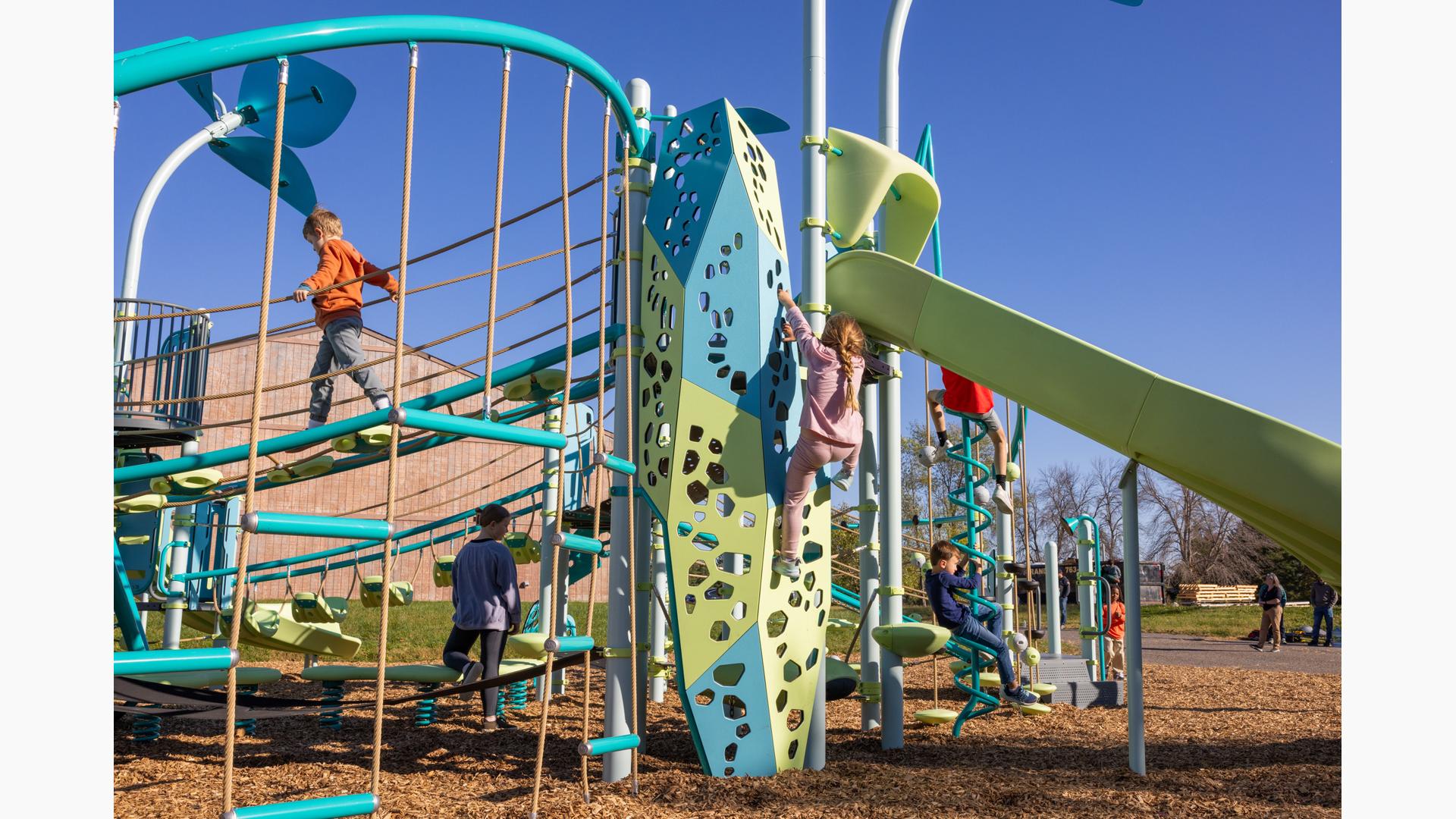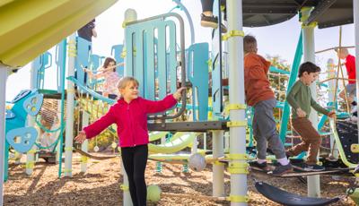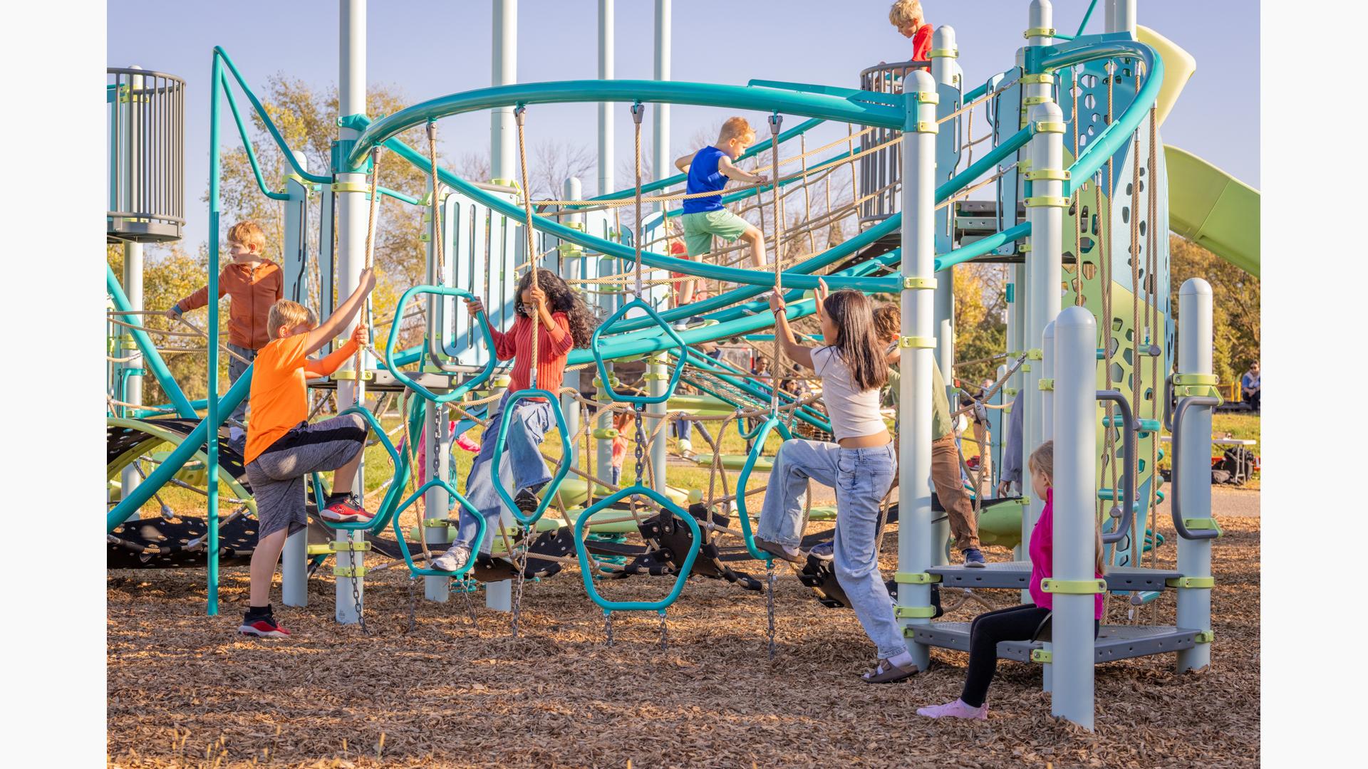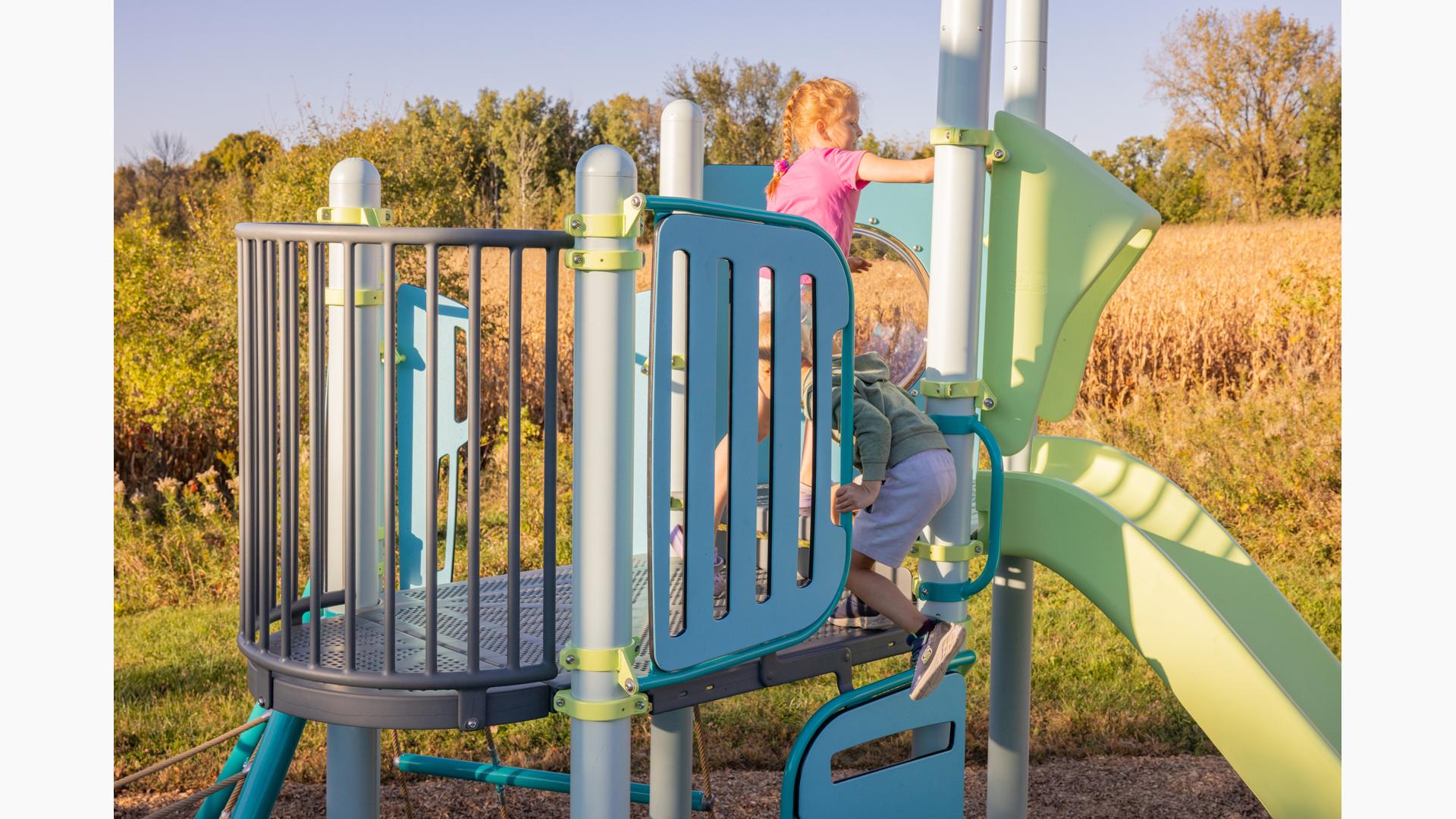 Spiral Grove wraps children in a continuous wave of movement, where curved slides, netted pathways and dynamic climbers create an immersive, multi-level adventure. Petal Canopies provide an organic, nature-inspired flourish, framing the space and inspiring the imagination. Kids navigate the connected activities of the playground via the entry point and path of their choice: scaling the Lotus™ Climber or the VertiGo™ Climber, crawling or stepping across the O-Zone® Array Climber. They might wobble along the Slack Line, or test coordination on the SwiggleKnots® Bridge Inclined. The PodHopper™, SaddleStep™ and BeltSwoop™ Climbers each challenge different abilities, though the journey may feel seamless and intuitive. Every climb, step or swoosh down the symmetrical FlowWinder™ and Alpine® Slides invites immersion in the three-dimensional flow.