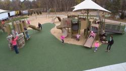 [video: Camera switch to an aerial view of the entire play area with the three playground structures, surrounding freestanding nature-inspired climbers, swing sets, and OmniSpin spinner. Close-up of children’s hands as they bang on one of the playground Rhapsody Goblet Drums. A young boy smiles while standing by the Rhapsody Kettle Drum as children play it. Close-up of a young girls face as she climbs across the playground monkey bars. Camera comes into focus on a young girl’s face as she looks down while walking on the recycle plastic lumber rope bridge. Close-up of the young girl’s feet as she walks over the planks of the rope bridge.]