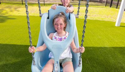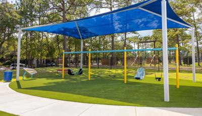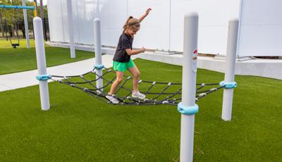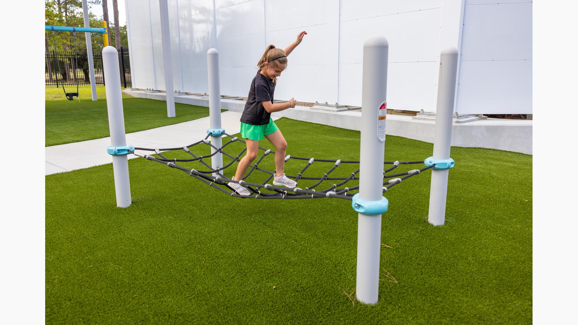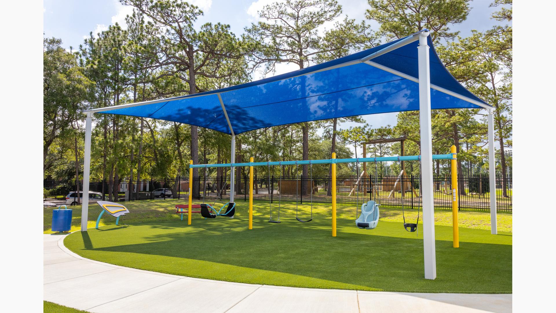 Kids looking for a bit of thrilling motion will seek out the ZipKrooz® track ride or the Topsy Turny® Spinner. And what's best, four royal blue SkyWays® shade sails arch over the play area, keeping the children cool and comfortable underneath.