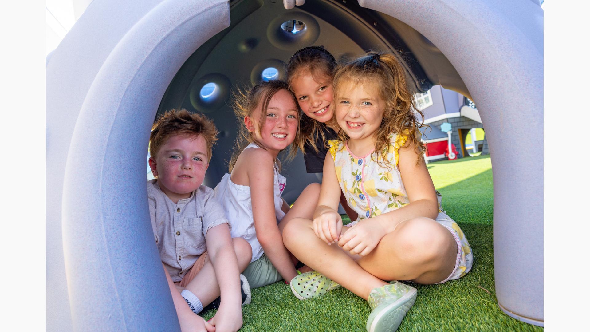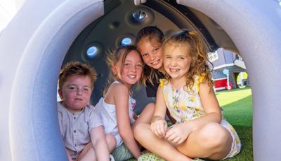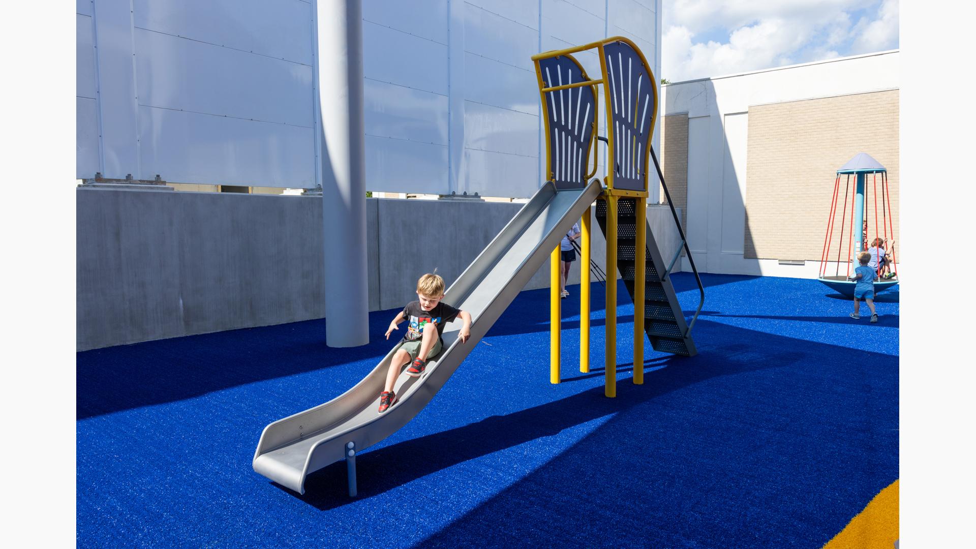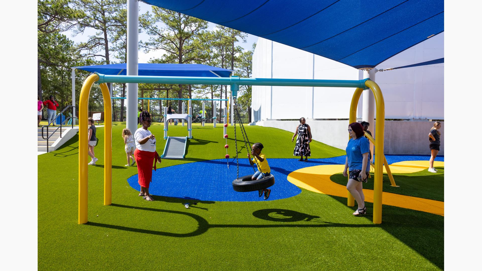 Kids looking for a bit of thrilling motion will seek out the ZipKrooz® track ride or the Topsy Turny® Spinner. And what's best, four royal blue SkyWays® shade sails arch over the play area, keeping the children cool and comfortable underneath.