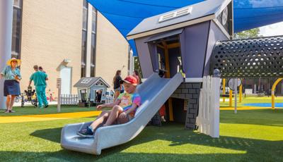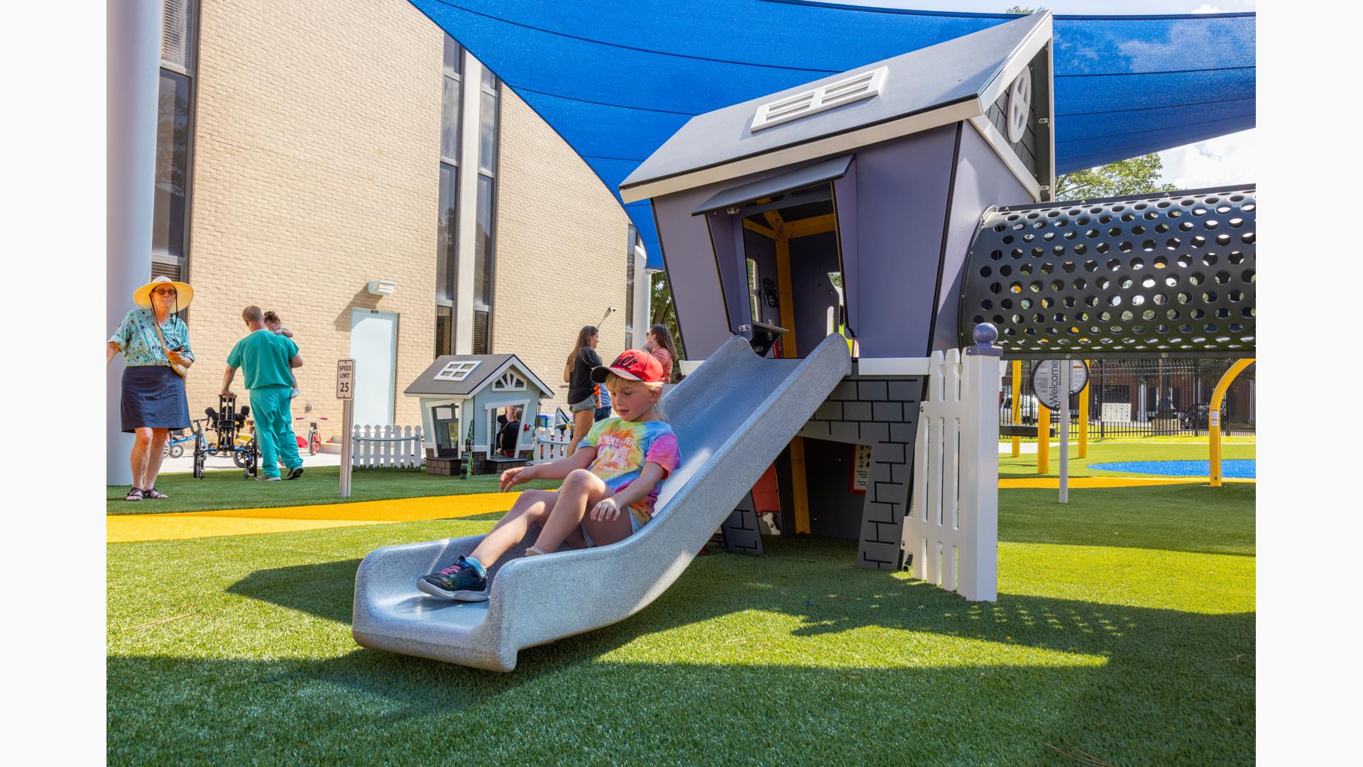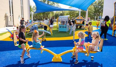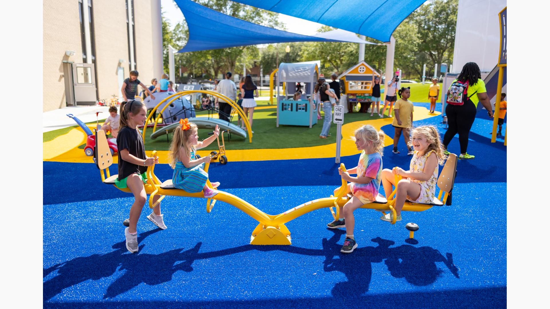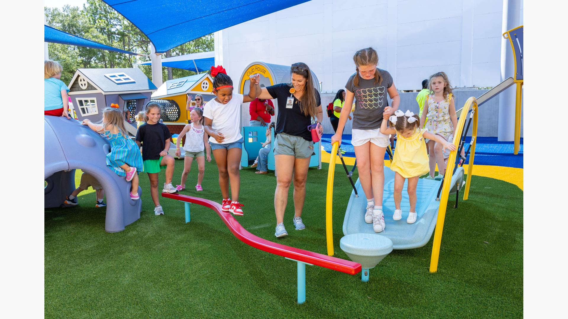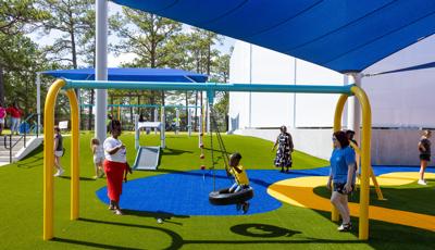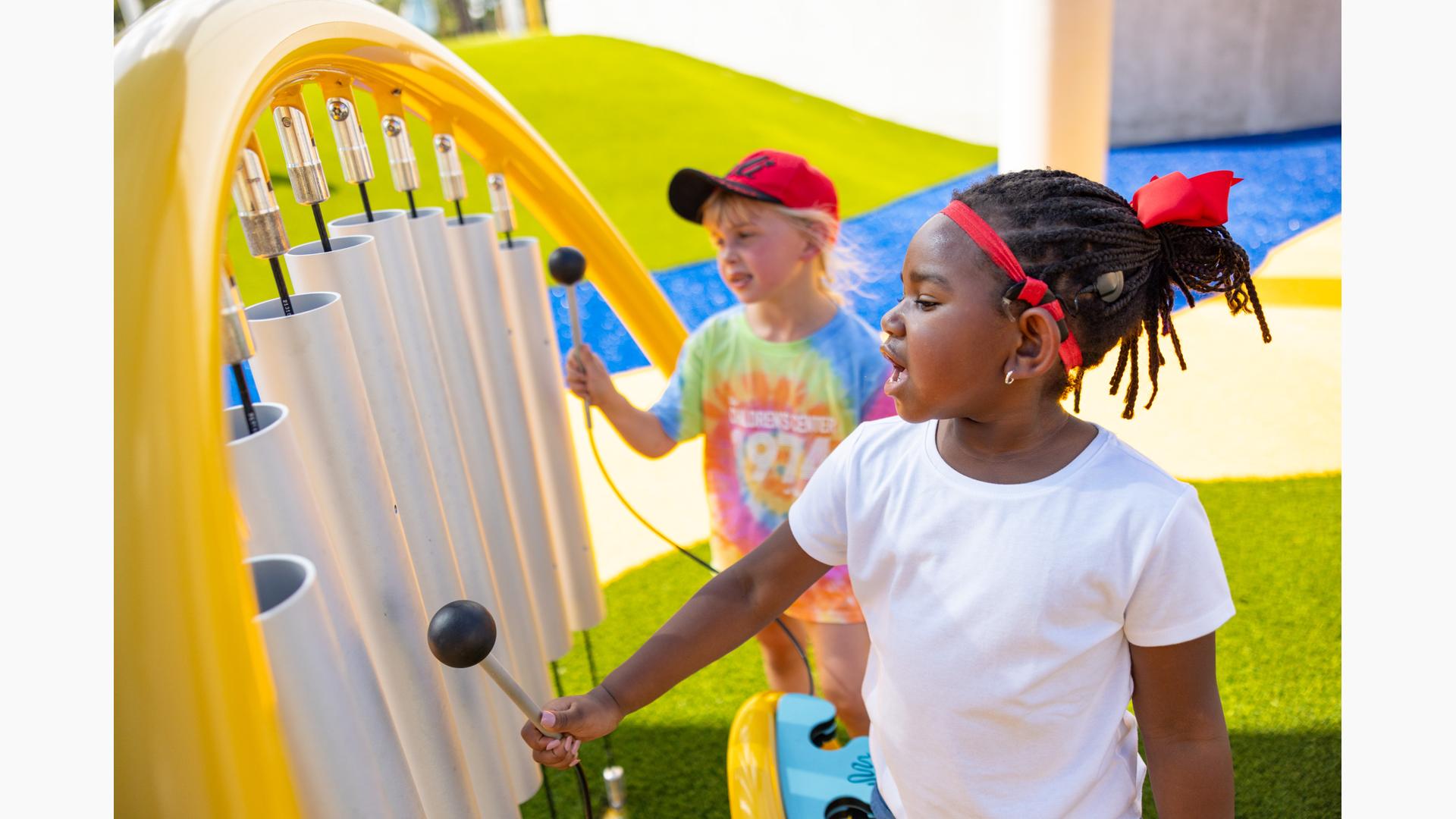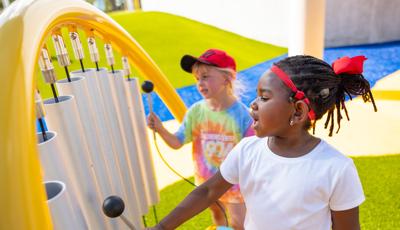 Contact Your ConsultantThe playground at the Children's Center for Communication and Development at the University of Southern Mississippi in Hattiesburg is flush with learning and sensory panels, imaginary play houses and motor play features for the early childhood age group. Learning panels feature early literacy essentials, like the Tracing Panel plus tactile and visual elements like the Mirror Panel® and Marble Panel. Musical play options abound, both in the Chimes Panel and the freestanding Rhapsody® Outdoor Musical Instrument collection.
