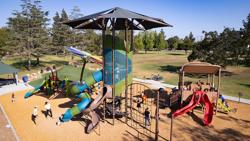 Bring your picnic to the playground at Thousand Oaks Community Park. The play space for toddlers and preschoolers is made to look like a picnic basket complete with DigiFuse® panels showing the anatomy of ants and bees, a watermelon climber and leaf climbers. For kids ages 5 to 12, the feature is a 12-foot Super Netplex® tower. The Spiral Belt Climber brings individuals of all abilities to the center of the action, while the Double Swoosh Slide® and TurboTwister™ Tunnel Slide takes them back to the ground. Even more, there is a freestanding butterfly net climber, caterpillar climber, grass wall climbers, a concrete-sculpted ant, a Cozy Dome® ant and so much more. Plus, a custom SkyWays® shade structure was included to provide a break from the heat and sun.
