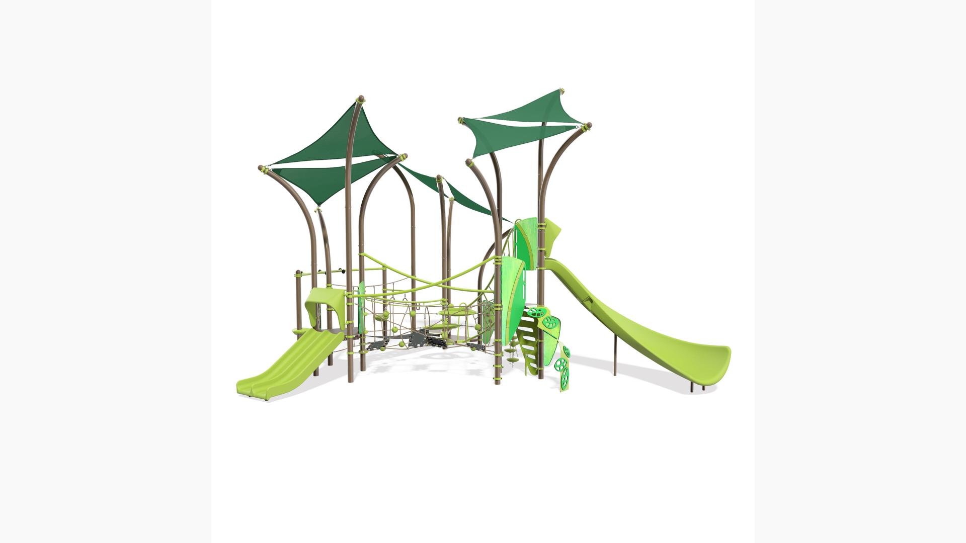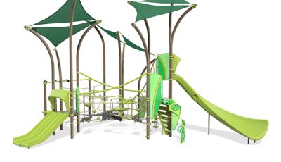 This wondrously abstract Smart Play® Tree Tops® playstructure gives kids the sense of exploring a forest canopy branch by branch. But beyond the normal ups and downs of traditional tree-climbing, here kids can also navigate their way across wiggly bridges, crawl through the O-Zone® 3-ring climber, roar down two different slides, plus so much more. Such a great range of interconnected activities at multiple levels will spark hours of imaginative and energetic play, all protected by plenty of built-in shade. Separate model available to meet EN design standards.