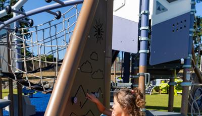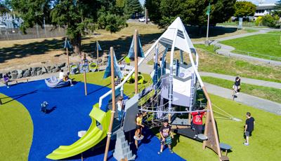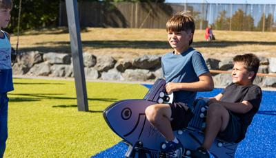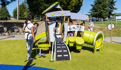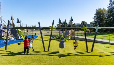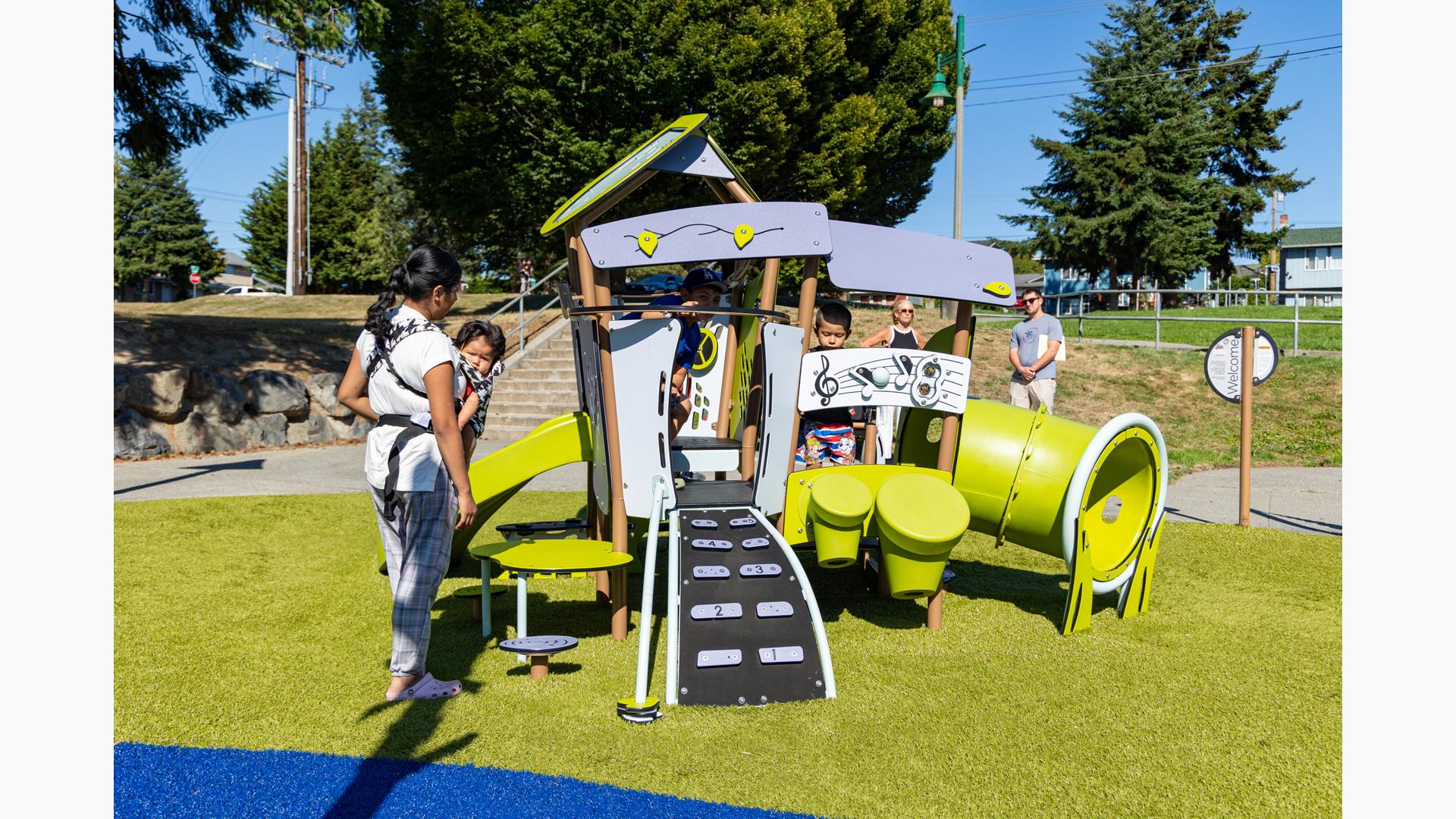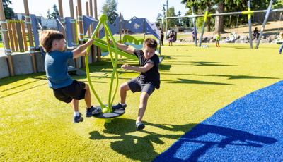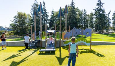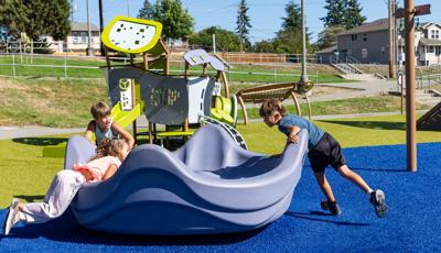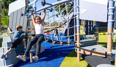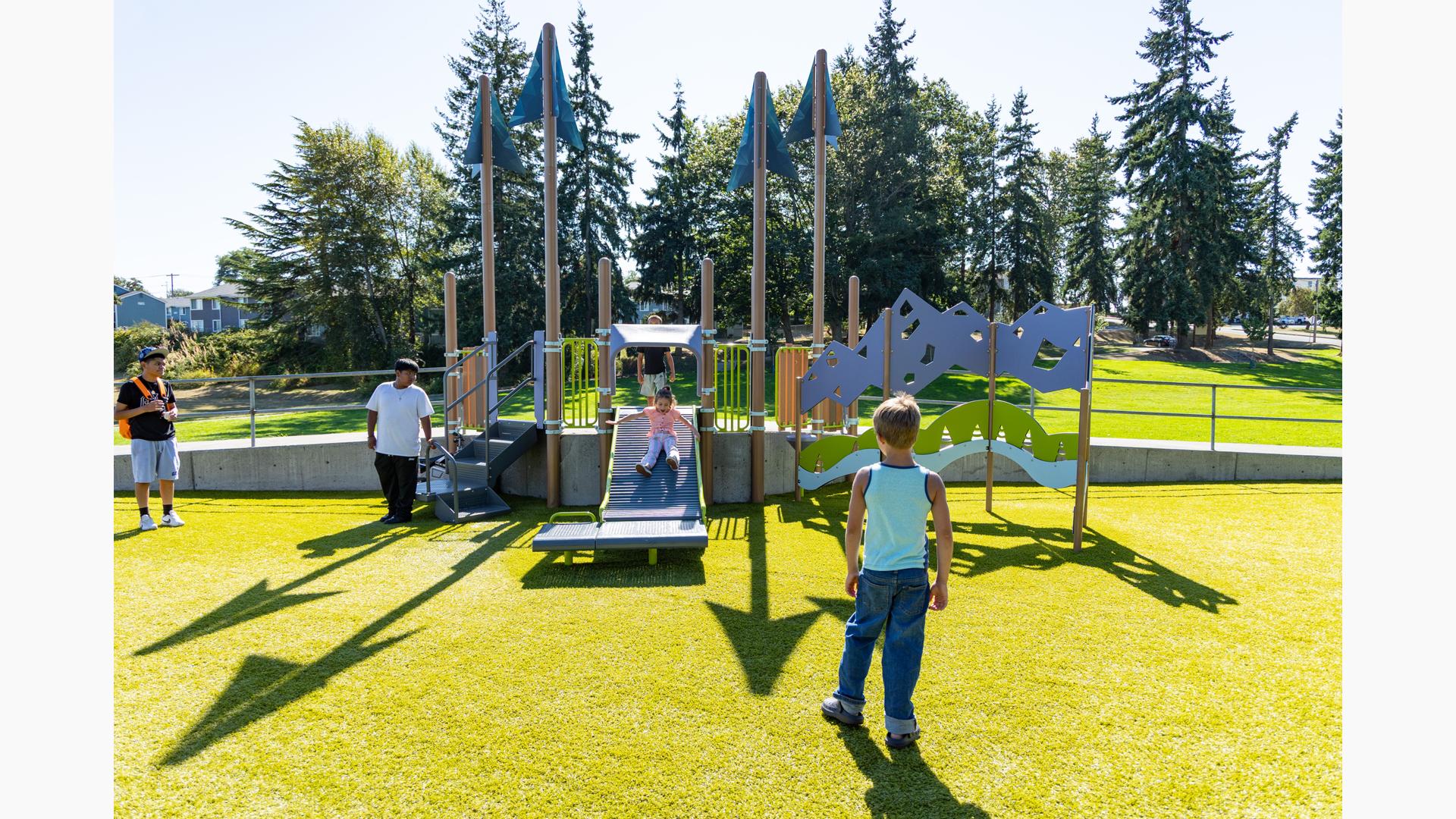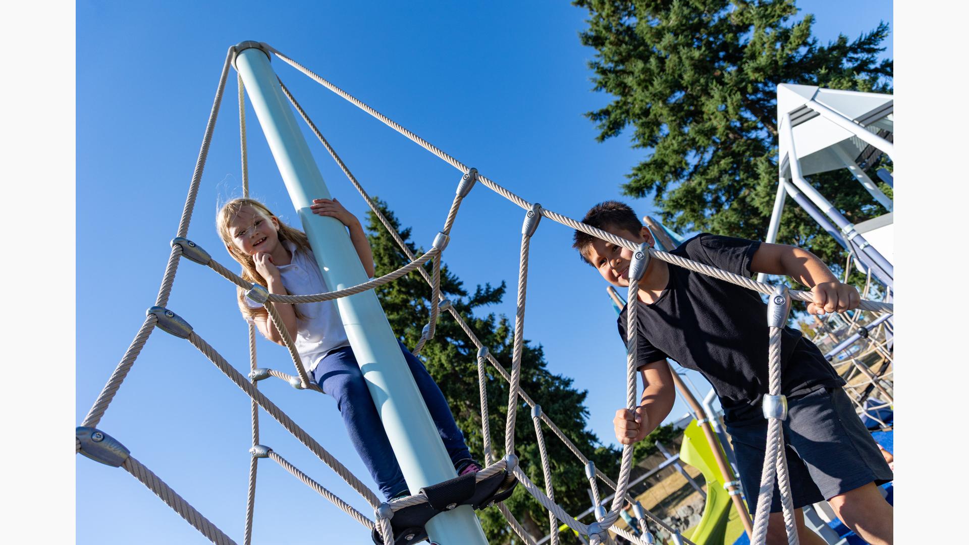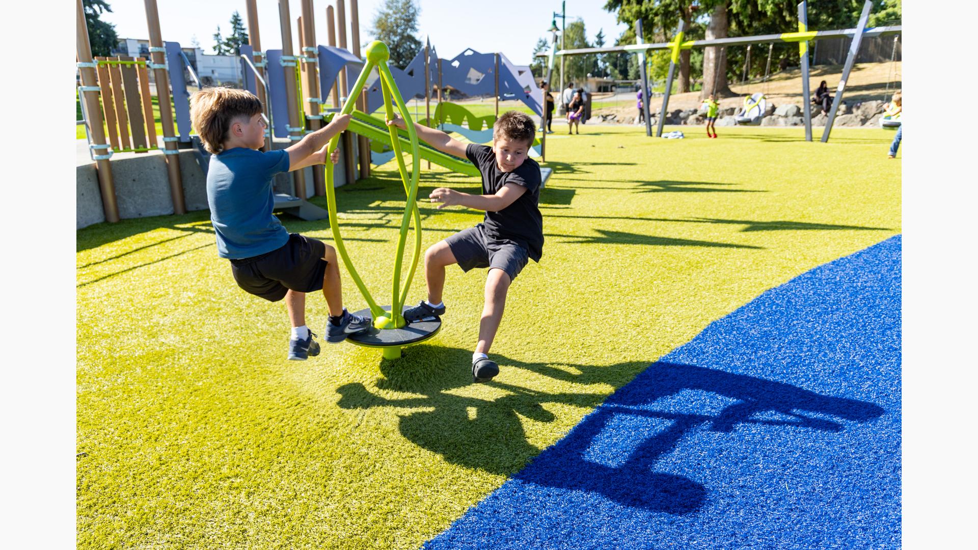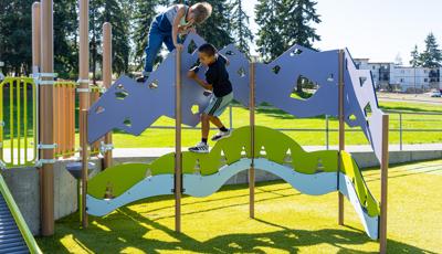 Contact Your ConsultantWiggums Hollow Park in Everett, Wash. is a mountain-themed adventure! The Smart Play® Summit™ play structure packs multiple activities into a compact space and a Lunar Burst® Net Climber challenges children to climb its wiggly cables to the apex. An angular triple-bay Forma™ swing set offers seat types for kids of all ages and abilities while maintaining the alpine look and feel of the space. A stone gray OmniSpin® Spinner offers dizzying movement, while the Smart Play Motion is a play structure for preschool kids that provides the imaginative, motor and social development they both need and love.