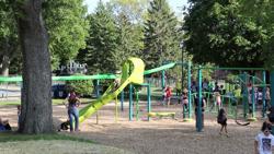 Video features a colorful Netplex play structure play structure with many different climbers, spinners, and slides at Windom North East Park in Minneapolis Minnesota.