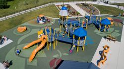 [video: camera switches to a full elevated view showing children playing at all the fun play activities at the park. A group of children ride together on an inclusive gliding swing accessible for wheelchairs. Scene switches to a view of the play structure where there is a tic-tac-toe panel and a double laned slide. A girl plays at play panel on the structure. The camera focuses on the tic-tac-toe panel as two boys spin the pieces from the opposite side. The camera peaks over the top of the panel as the two sit on the playground decking and play with the tic-tac-toe panel.]