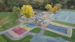 [video: elevated panning left to right view of entire play area with basketball courts in background. A young boy says hello off camera.]
