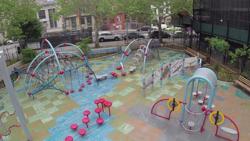[video: fade in to an overhead panning view over the playground area, fade out. Fade in to an elevated view of the Evos play structures with surrounding pod steppers and other playground activities. The hum of traffic buzzes by in the background. Camera pans on the back side of an O-Zone climber and across the playground to the second O-Zone climber, fade out. Fade in to overhead panning view over the top of the playground area.]